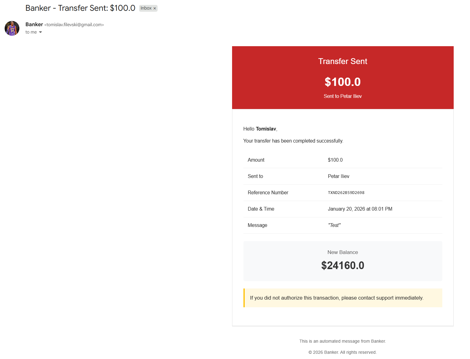 subject = f'Banker - Transfer Sent: ${amount}'