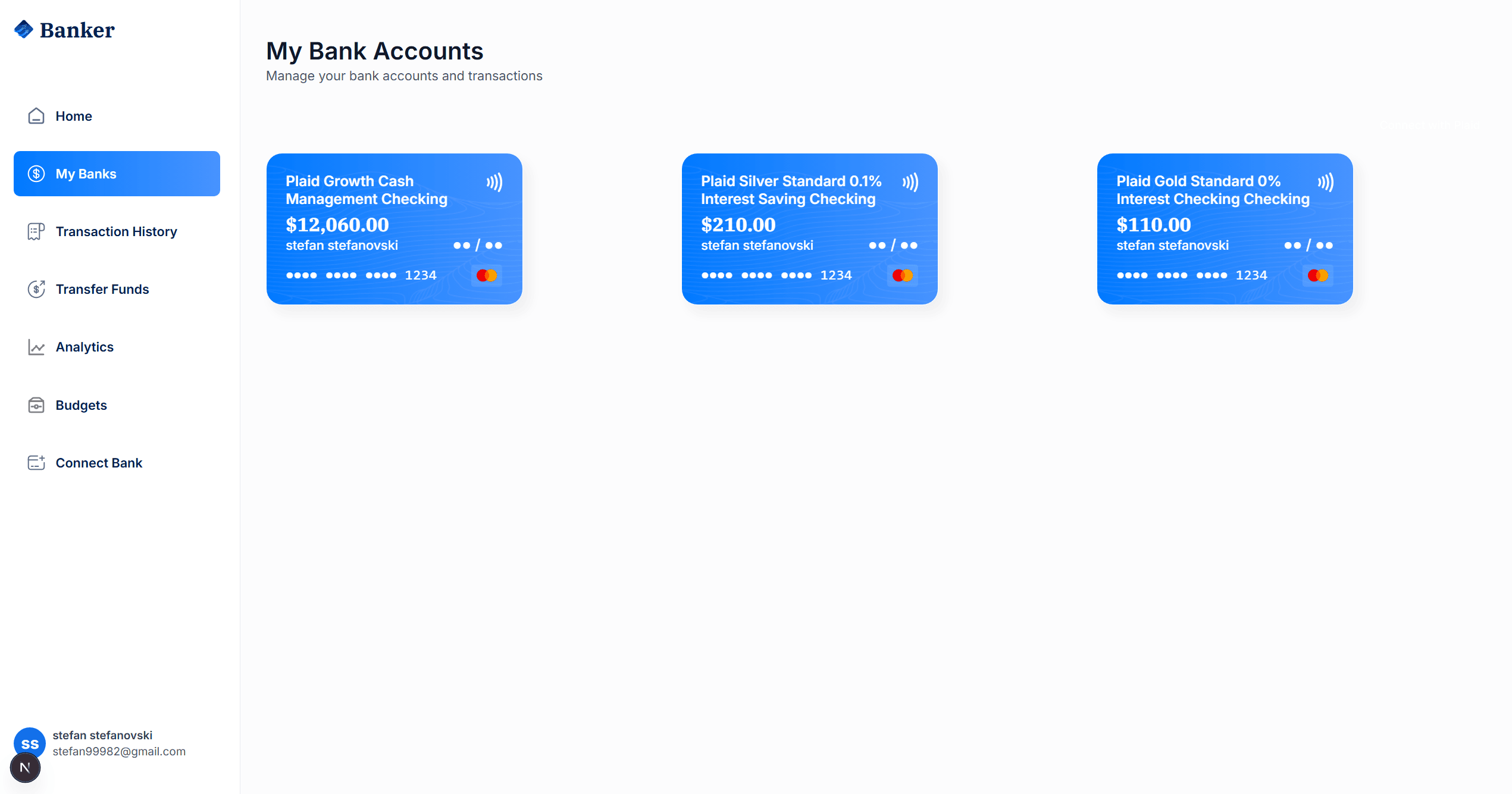Корисникот кликнува на My Banks во навигацијата и ги гледа сите поврзани банкарски сметки прикажани како визуелни картички со баланс и детали.