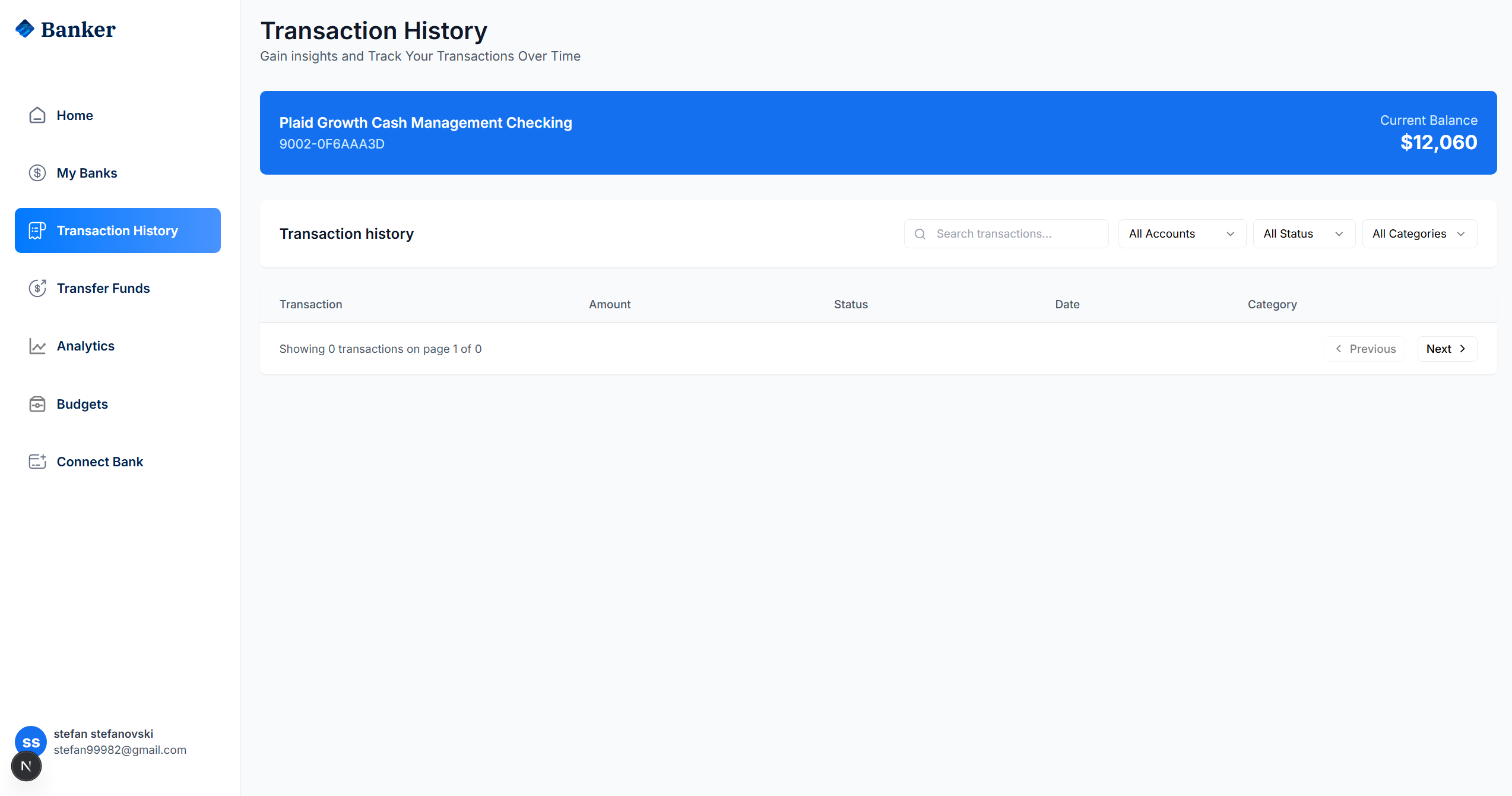 Корисникот кликнува на Transaction History и ја гледа табелата со сите трансакции. Може да филтрира по сметка, статус и категорија.
