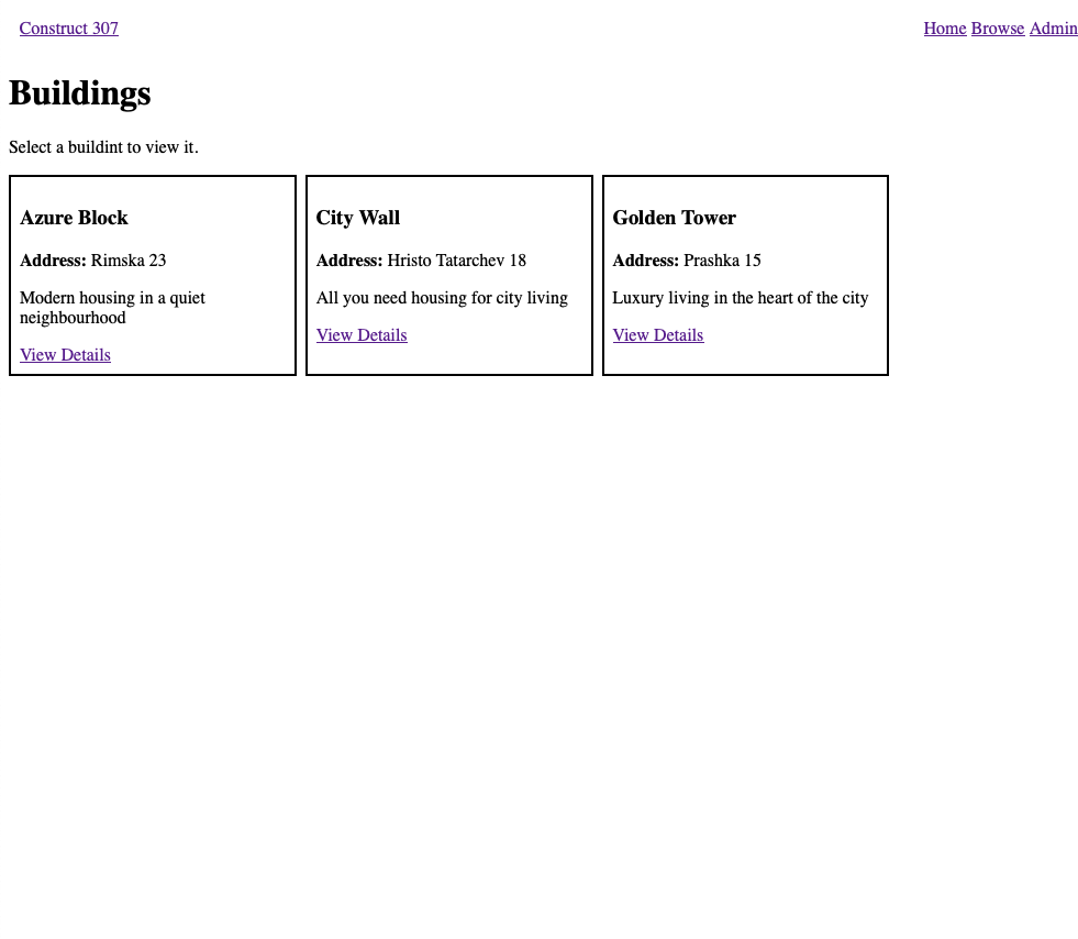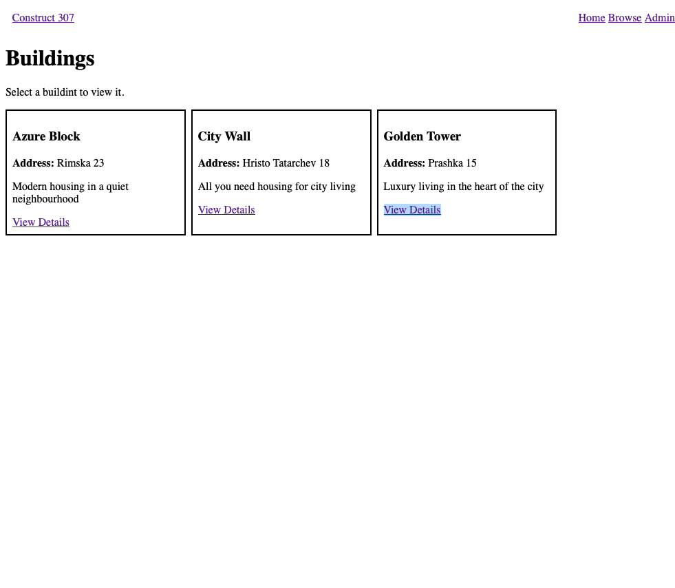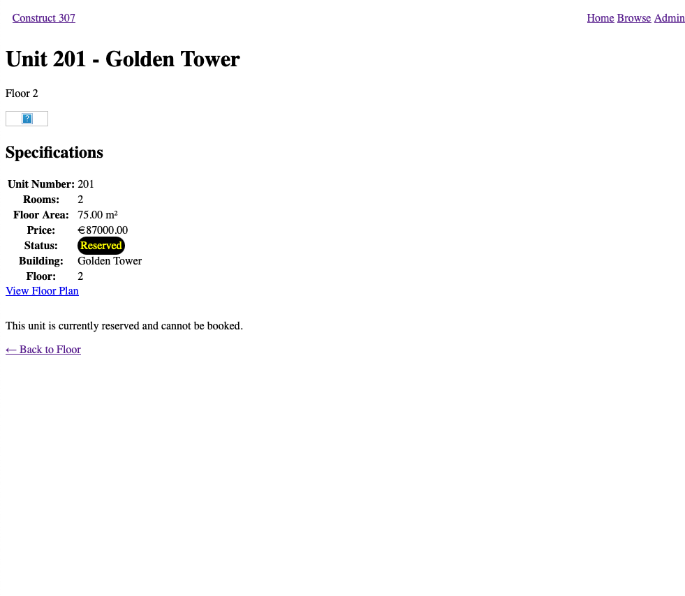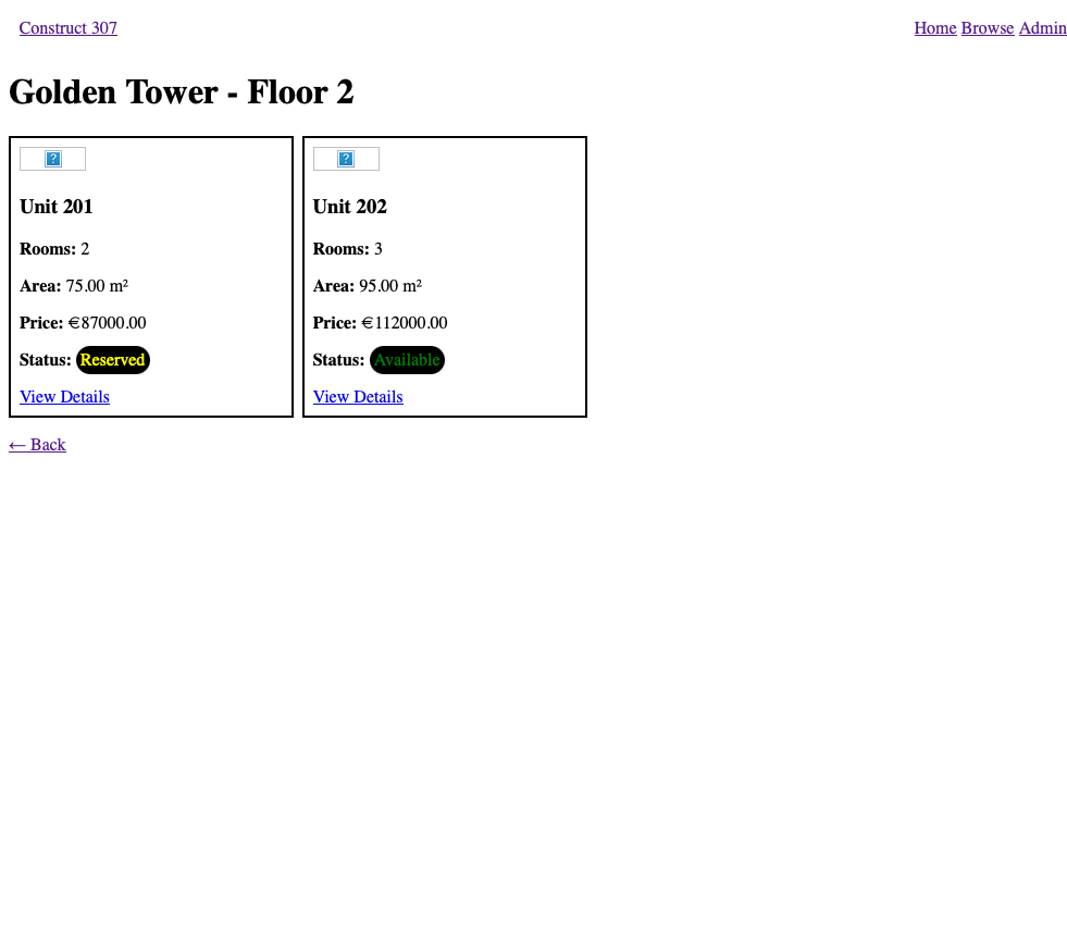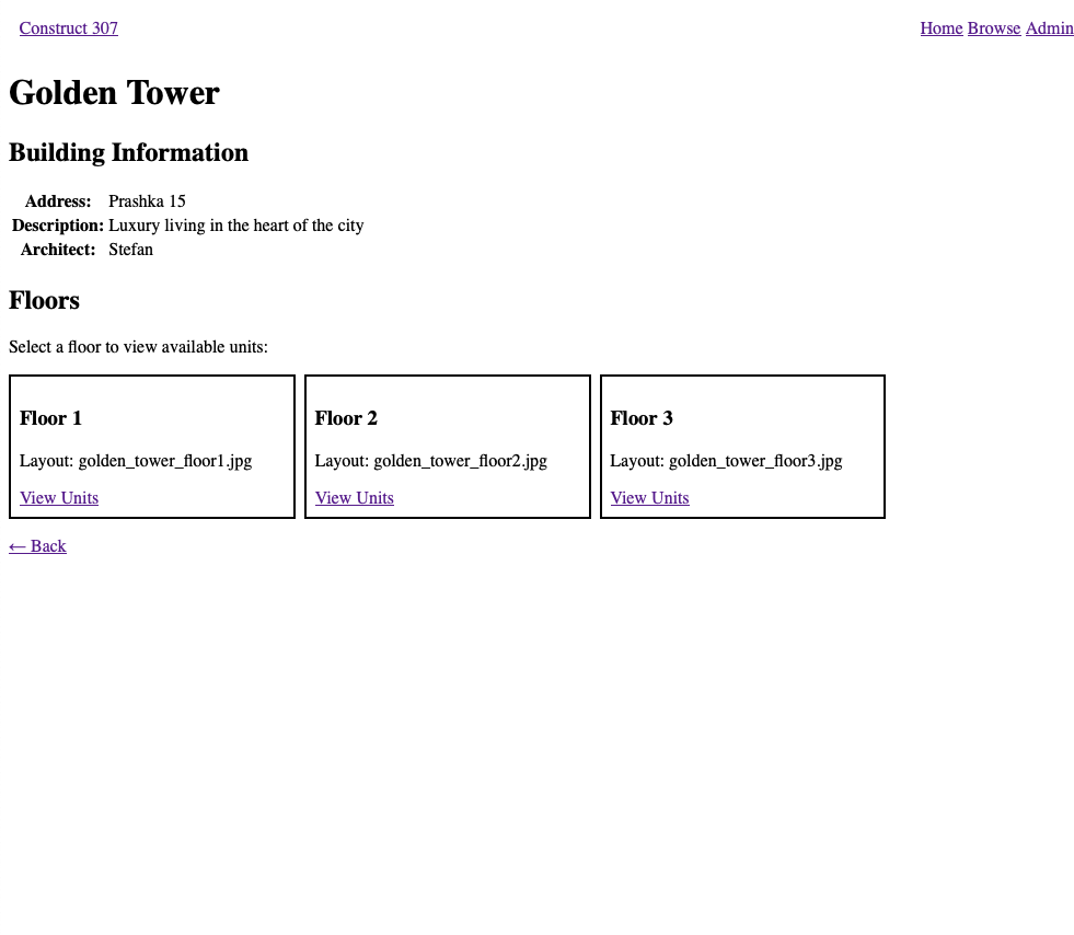 A client browses apartment units by first selecting a building, then viewing its floors, and finally exploring individual units. They can view details, images, and pricing information for each unit.
