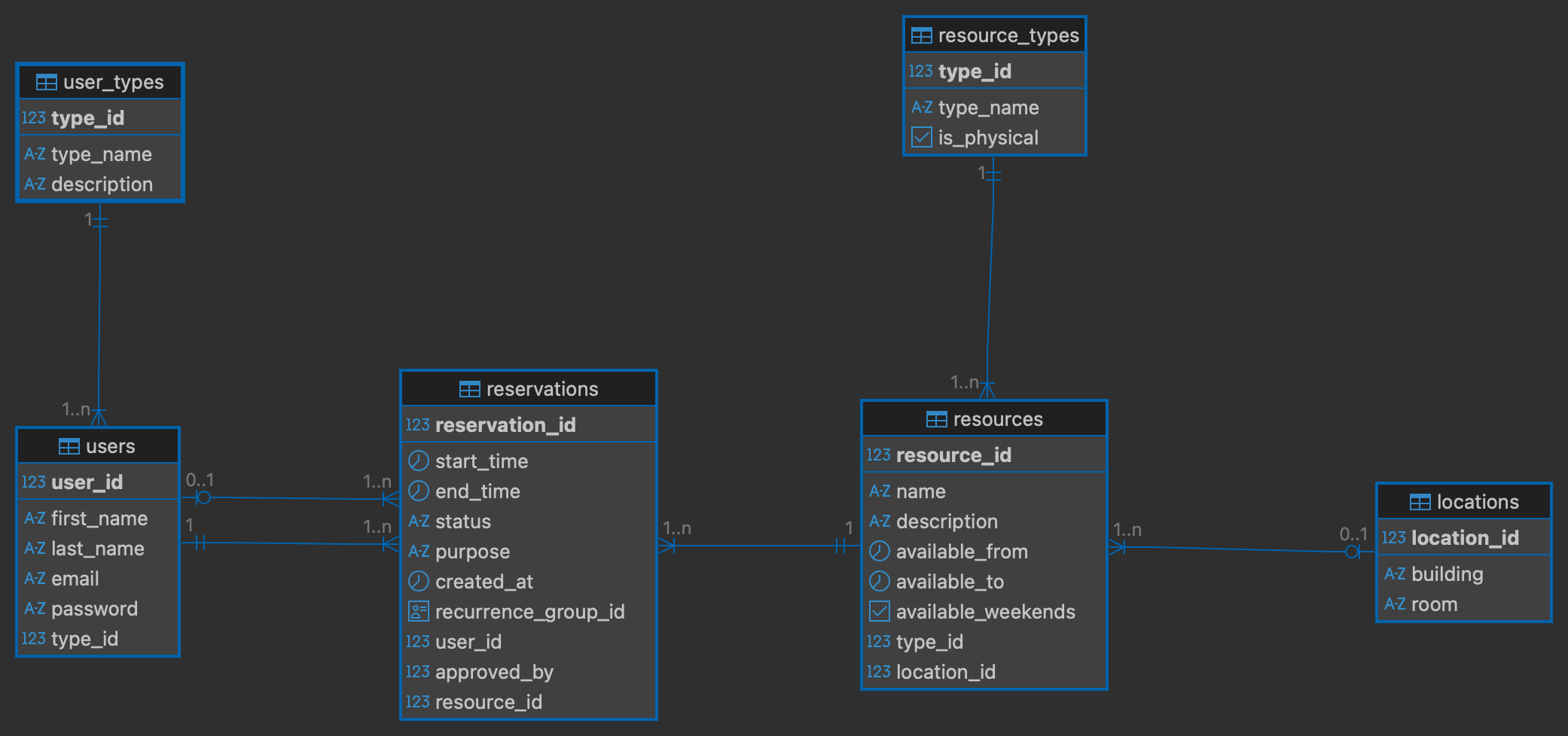 reservations(__reservation_id__, start_time, end_time, status, purpose, created_at, recurrence_group_id, user_id(FK), approved_by(FK), resource_id(FK))
