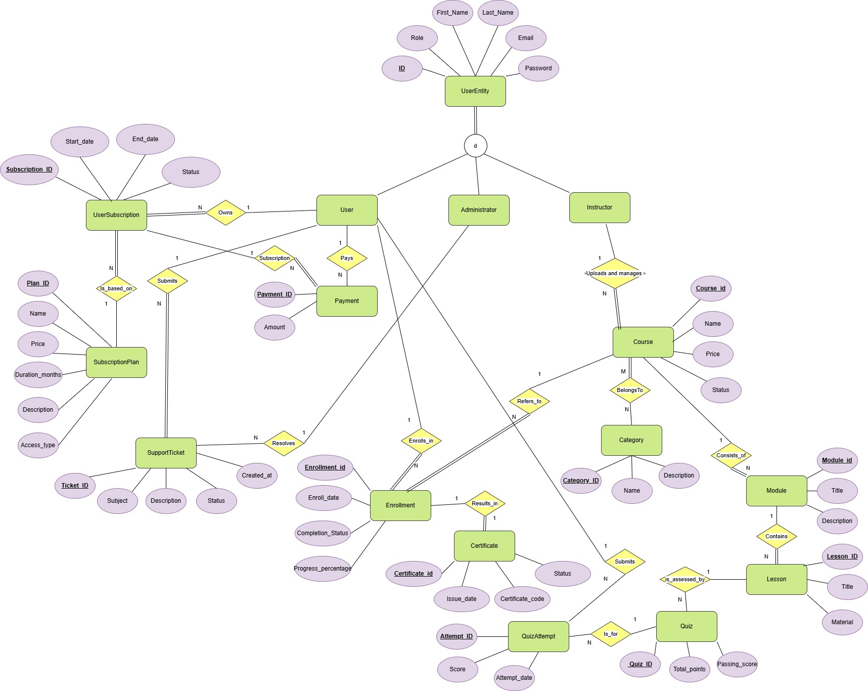 - Results_in - 1:1 relationship between Enrollment and Certificate. Each enrollment can lead to exactly one certificate. Each certificate is issued for exactly one enrollment.