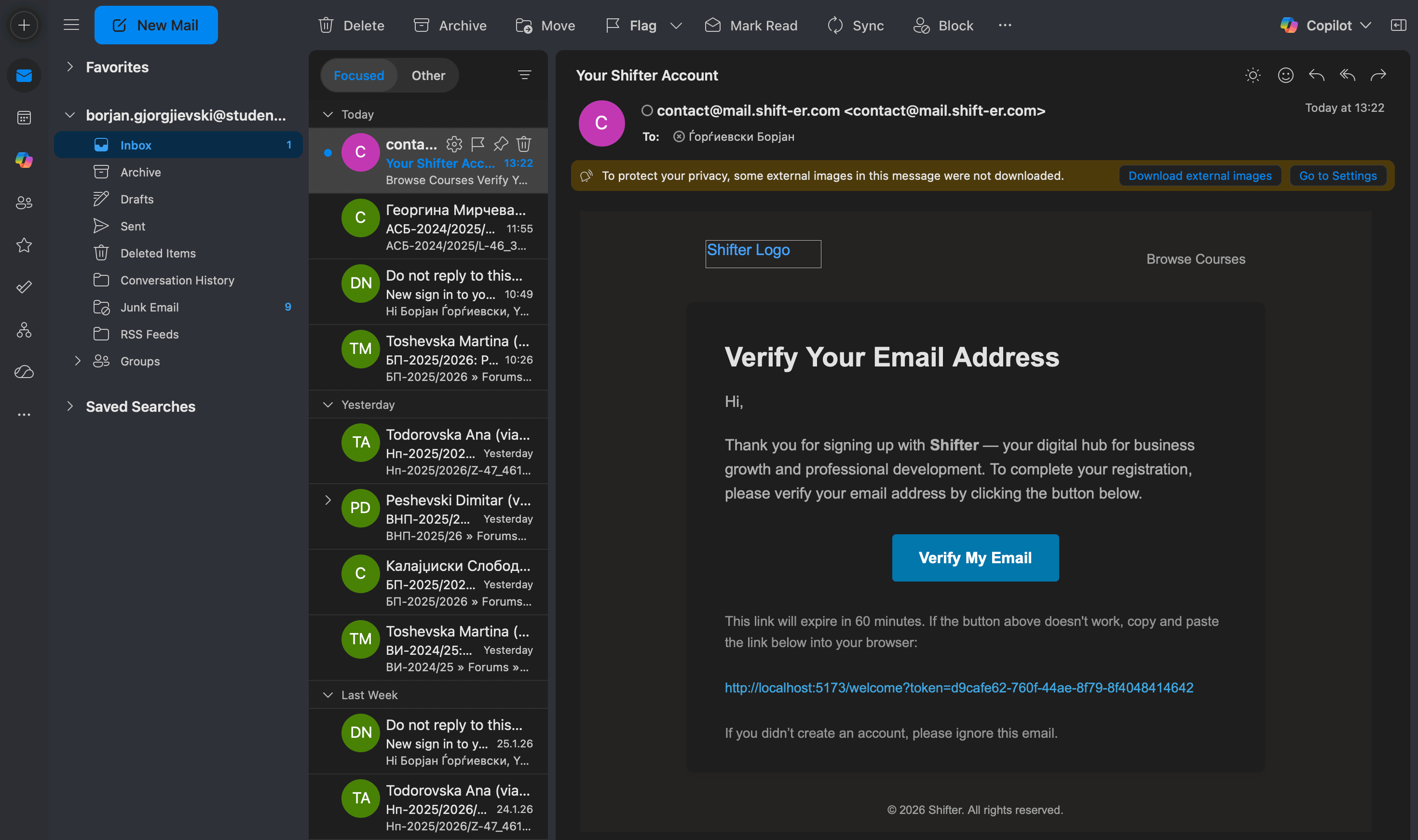 - На корисникот му се прикажува порака за успешно испратен линк за потврда на неговата мејл адресата. Во базата се креира иницијален корисник и верификациски токен.