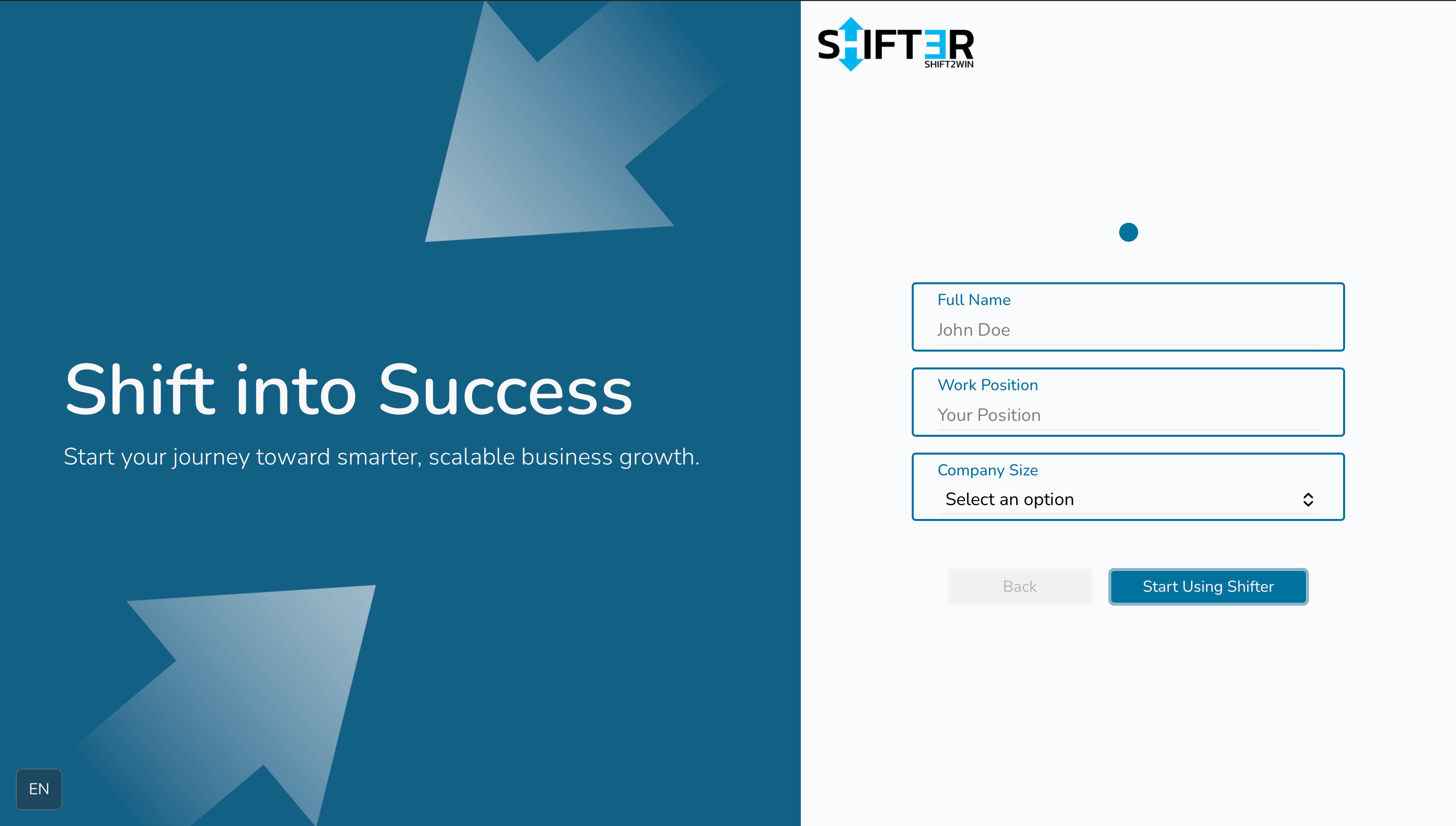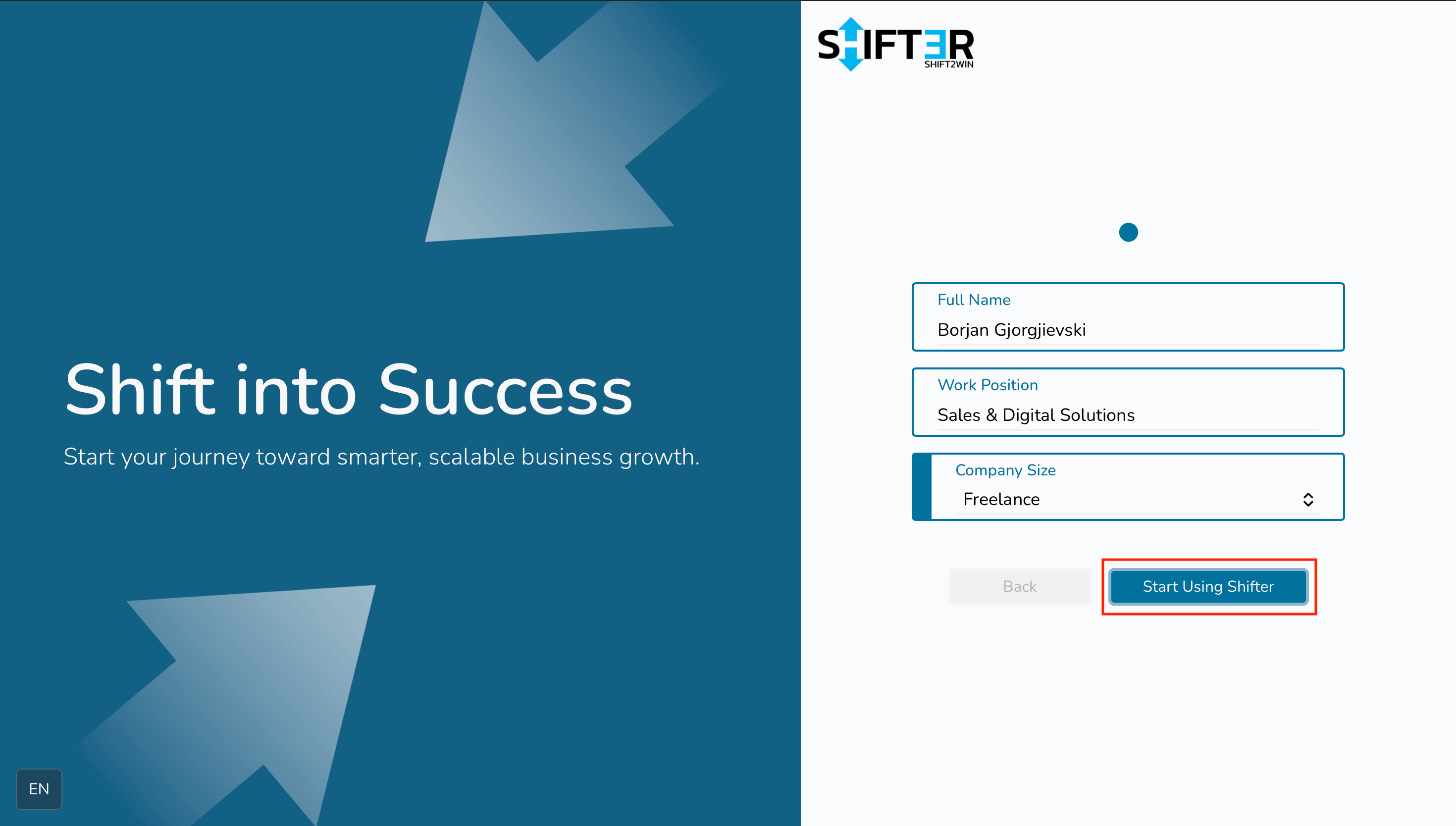 - Корисникот ги пополнува полињата за персонализација и кликнува на копчето Start Using Shifter. Во базата се ажурираат полињата за персонализација.