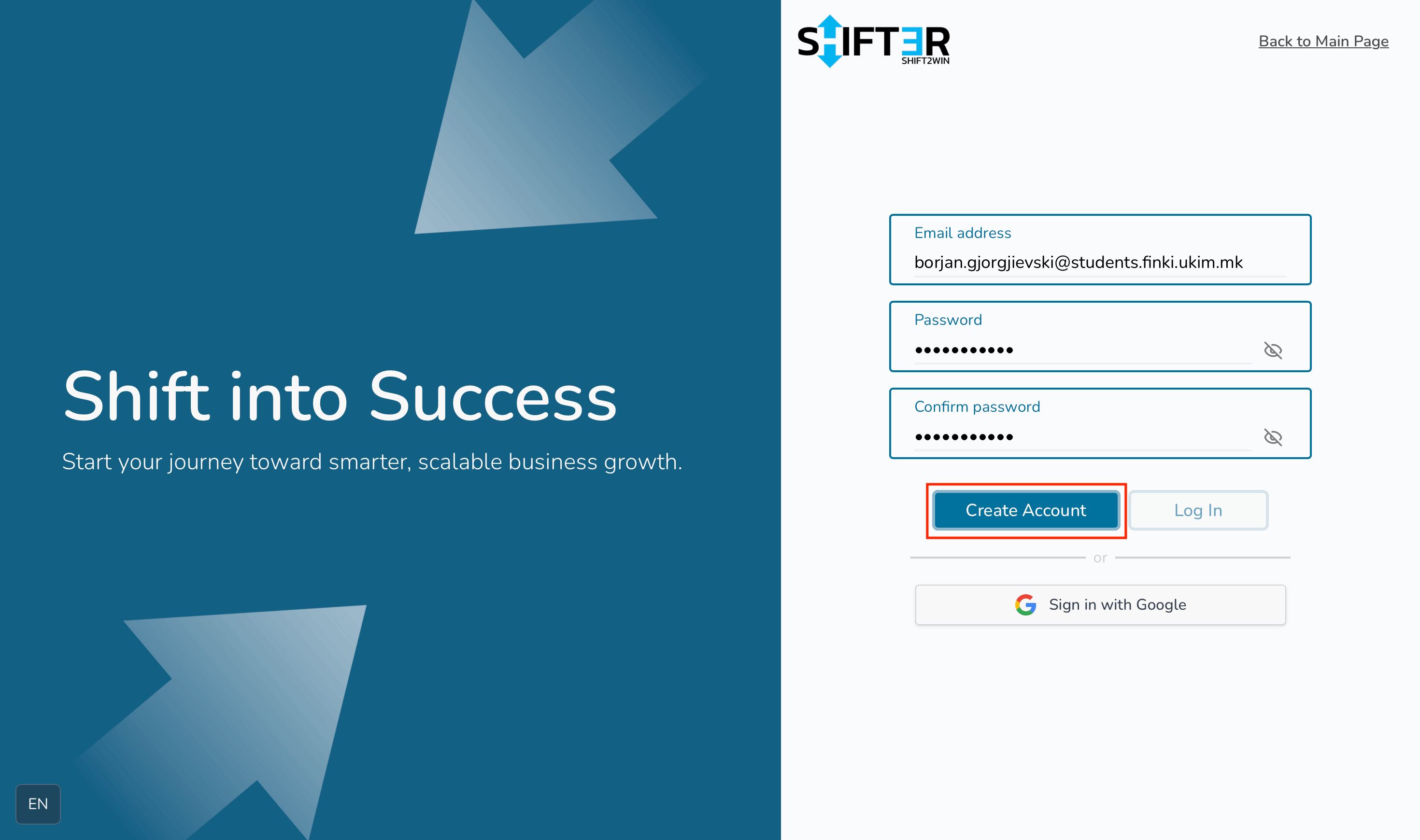 - Корисникот ги пополнува полињата за регистрација и кликнува на копчето Create Account