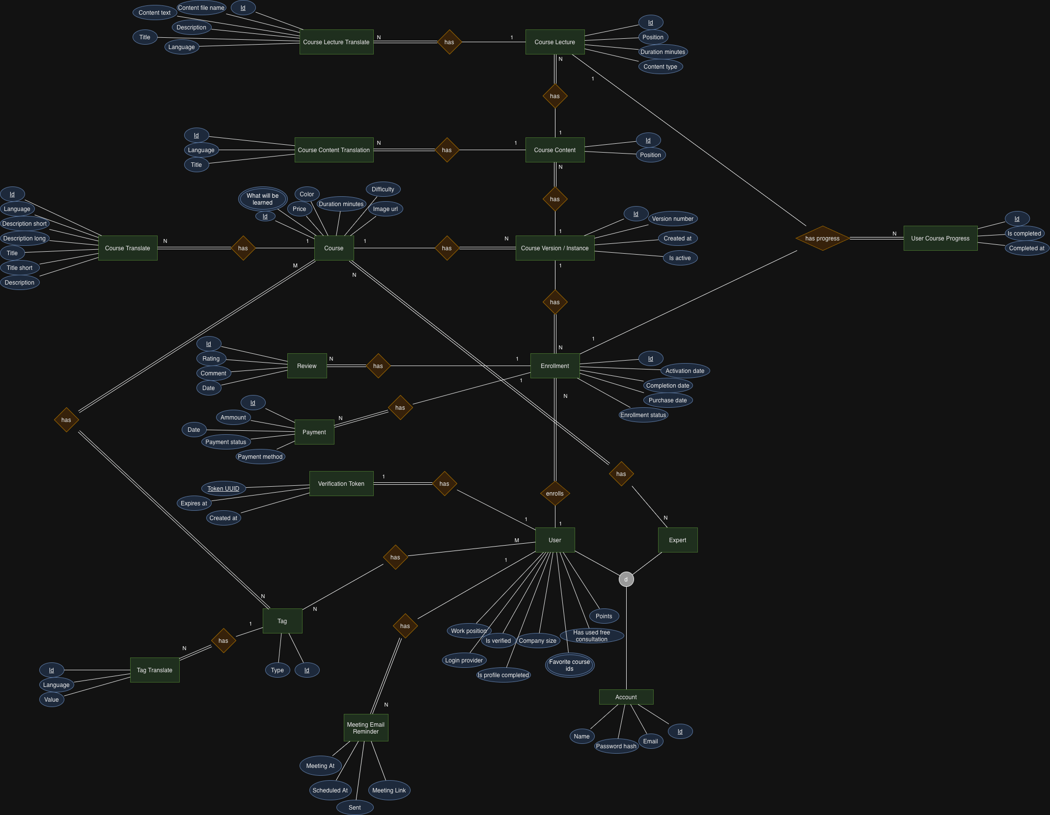 - has (COURSE ↔ COURSE_VERSION, 1:N) Една инстанца на Course може да има повеќе инстанци на CourseVersion. Секоја инстанца на CourseVersion припаѓа на точно една инстанца на Course.
