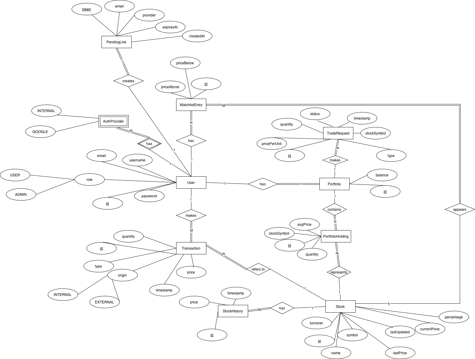 contains (Portfolio ↔ PortfolioHolding, 1:N) Едно портфолио може да содржи повеќе позиции (акции), додека секоја позиција припаѓа на едно портфолио.