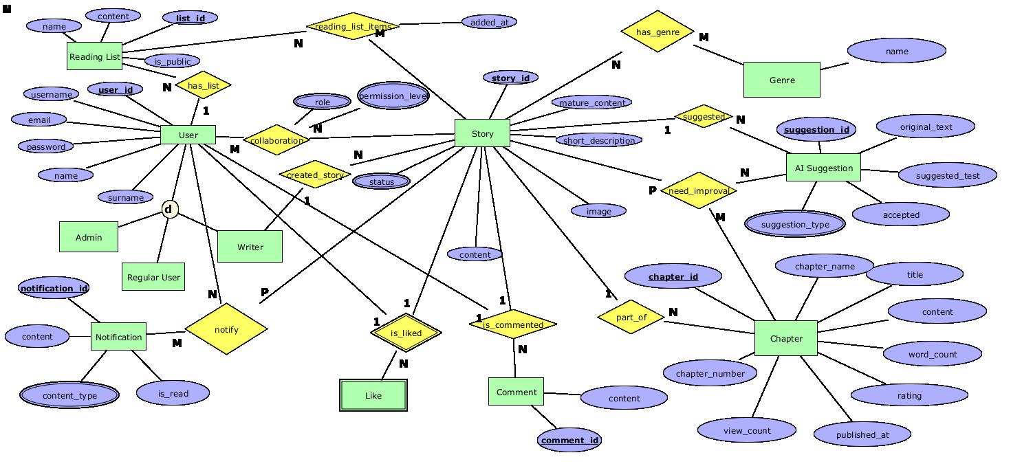 User 1:N LIKE, Story 1:N LIKE (One user can like many stories, one story can have many likes)