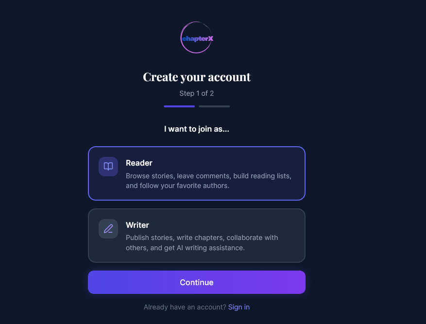 - First, the user needs to choose the type of user they want to register as — in this case, as a writer.