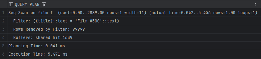 PostgreSQL прави последователно скенирање на целата film табела, што значи дека мора да ги прочита сите редови за да го најде точниот наслов. Ова резултира со поголемо време за извршување, особено кај табела со голем број на редови.