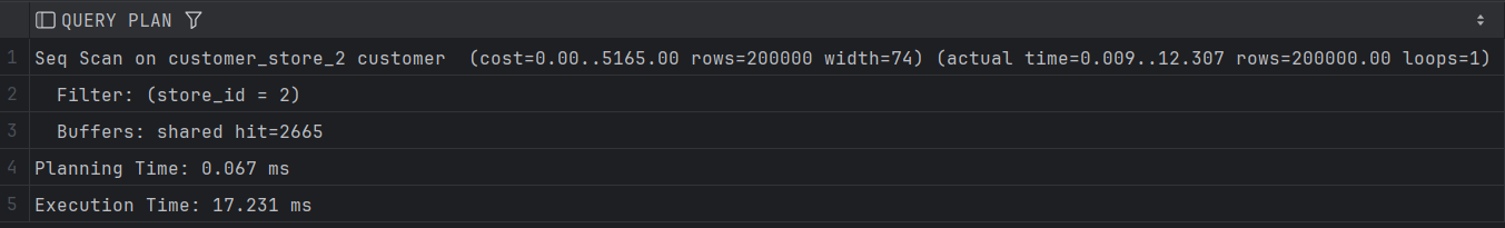 Со помош на механизмот pruning PostgreSQL ја скенира само customer_store_2 партицијата каде што store_id=2 и поради тоа се скенираат само 200 000 редови наместо 1 000 000 редови.