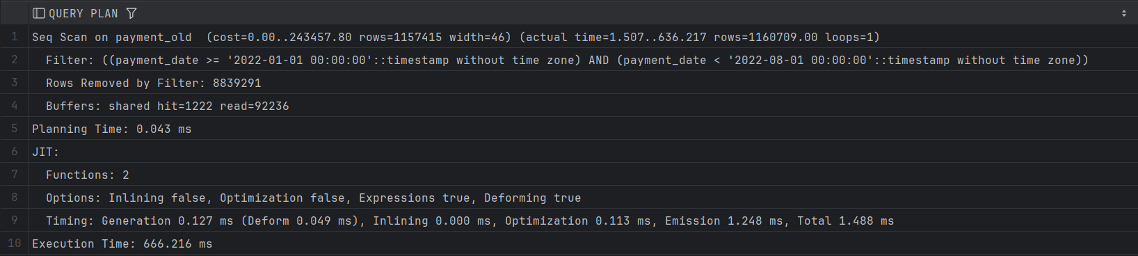EXPLAIN ANALYZE SELECT * FROM payment_old WHERE payment_date >= '2022-01-01' AND payment_date < '2022-08-01';