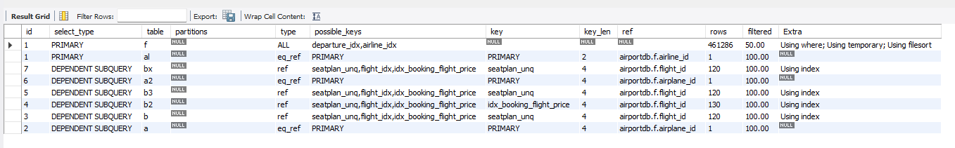 - Користи CTE и JOIN наместо subqueries - го пресметува booked_seats и avg_price само еднаш преку GROUP BY, наместо за секој ред посебно.