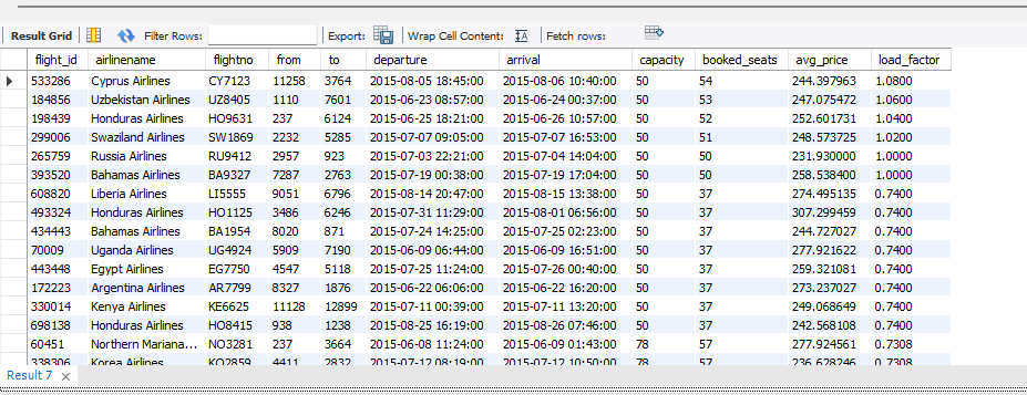 “За утрешниот ден, за секој лет да се прикаже: авиокомпанија, рута, време, капацитет на авион, број резервирани места, load factor (% пополнетост), и просечна цена по резервација. Да се филтрираат само летови што веќе имаат барем 1 резервација и сортирај по највисок load factor.”