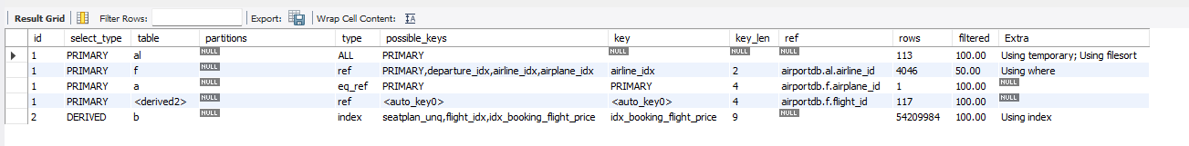 ALTER TABLE flight ADD INDEX ix_flight_departure (departure); - за да се филтрираат утрешните летови брзо ALTER TABLE booking ADD INDEX ix_booking_flight (flight_id); - за агрегирање по flight_id во booking ALTER TABLE booking ADD INDEX ix_booking_flight_price (flight_id, price); - ако бизнис барањата често налагаат пресметување на цената во просек или некои операции.