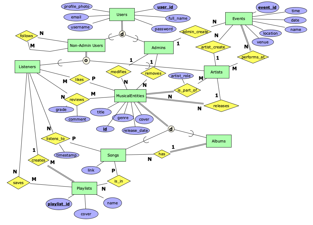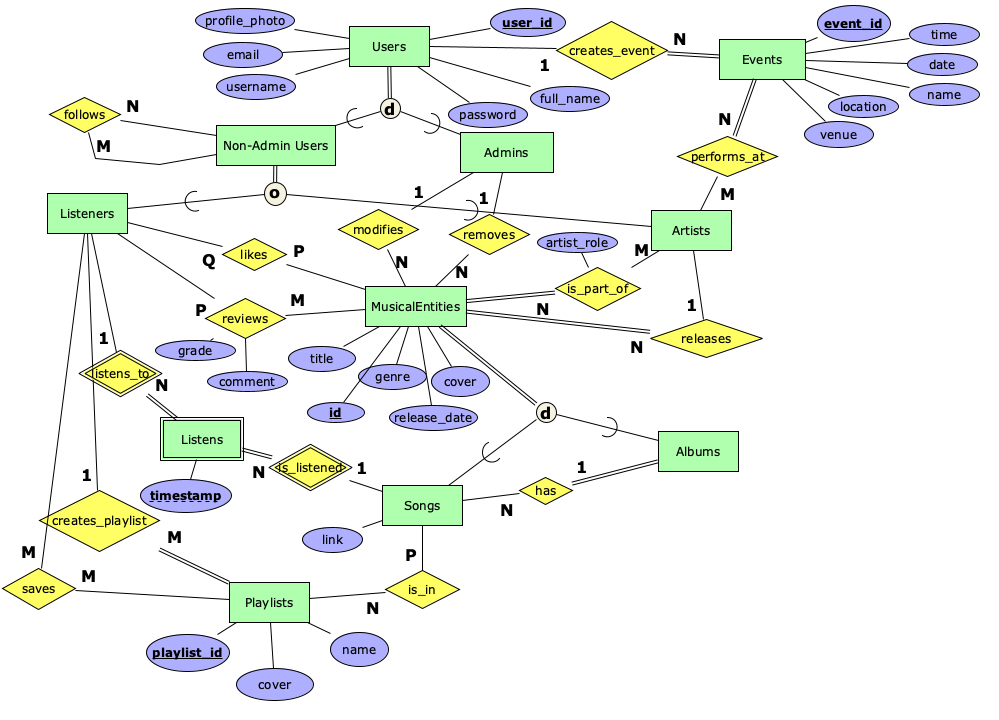 - creates_playlist (Listener ↔ Playlist, 1:M)