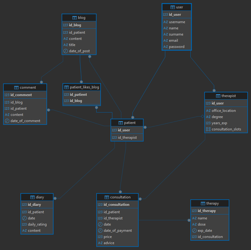therapist (id_therapist, id_user*, office_location, degree, years_exp)