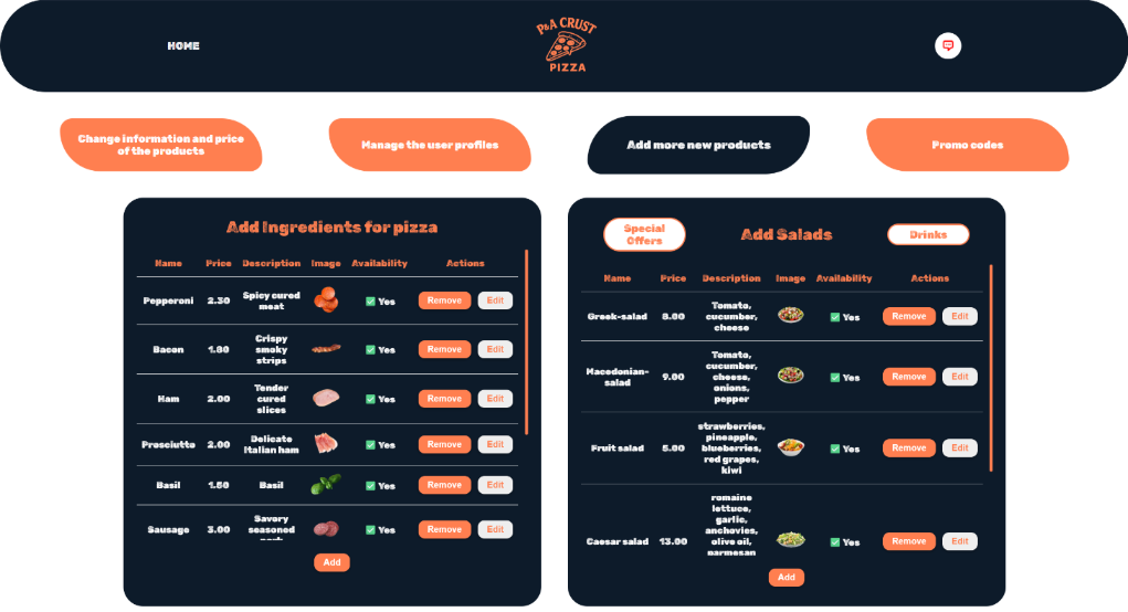 Управување со мени овозможува целосна контрола врз се што се прикажува на менито на апликацијата. Администраторот може да додава, уредува и брише производи од различни категории – како пици, салати, пијалоци, десерти, сосови и специјални понуди. Секој производ има свои основни информации (име, цена, опис, слика и достапност), кои може да се менуваат преку интуитивен интерфејс. При секоја промена, податоците се ажурираат преку REST API повици кон Django backend-от, користејќи JWT токени за автентикација.