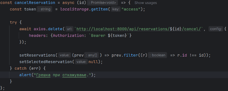 cancelReservation функцијата се повикува кога корисникот ќе одбере да ја поништи некоја своја активна резервација. Најпрво, од localStorage се зема токенот за пристап (access token), кој служи за автентикација на корисникот при барањето кон серверот. Потоа, со помош на библиотеката axios, се праќа HTTP DELETE барање кон API-то на адресата http://localhost:8000/api/reservations/{id}/cancel/, каде што {id} претставува идентификаторот на резервацијата што се откажува. Ако серверот успешно ја обработи операцијата, резервацијата веднаш се отстранува од локалната состојба со setReservations.