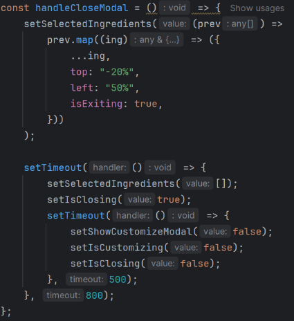 Делот за креирање сопствена нарачка во овој код ја опфаќа целата логика за персонализирање на пица. Во овај дел имаме дефинирање на handleCloseModal со showCustomizeModal, коj ја контролира видливоста и анимацијата на модалот за прилагодување. Потоа се дефинираат сите достапни состојки (items) со нивните својства како име, цена, слика, број и максимален број на додатоци. Функцијата handleAddIngredient ги додава визуелно на пицата.