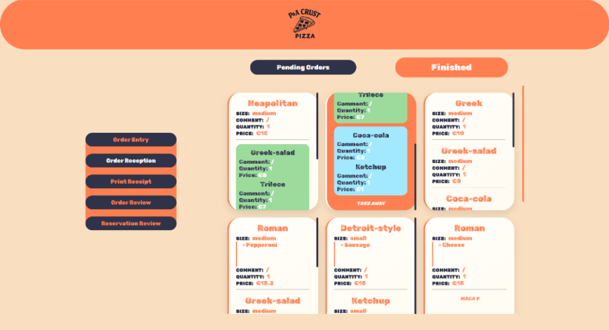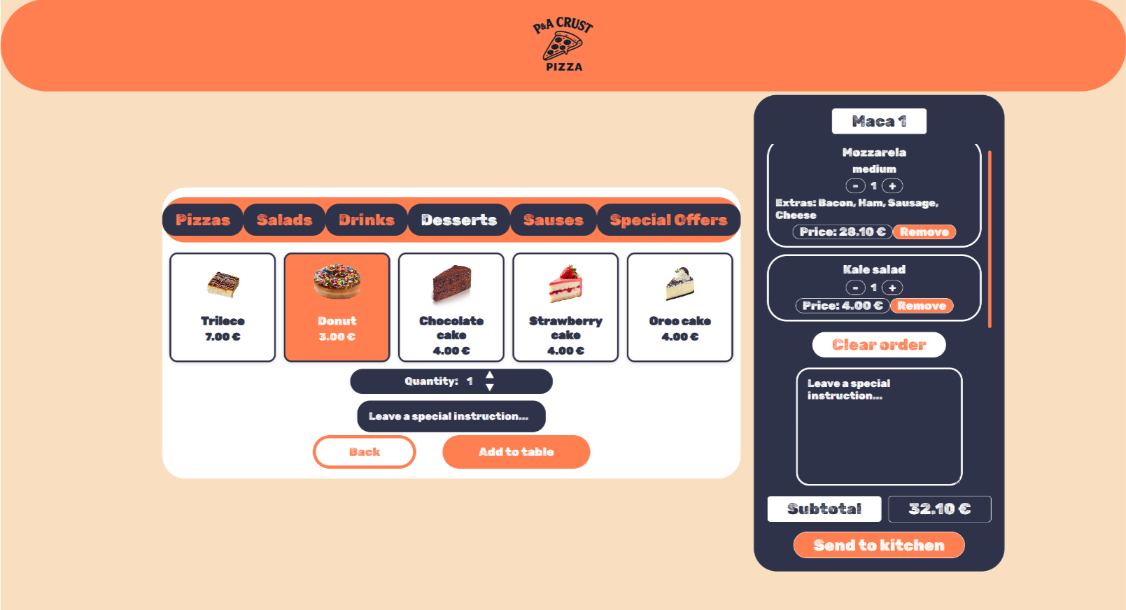 | 7 | Креирање на сопствена пица | Корисникот избира големина на пица и состојки за да направи пица по сопствен избор. |