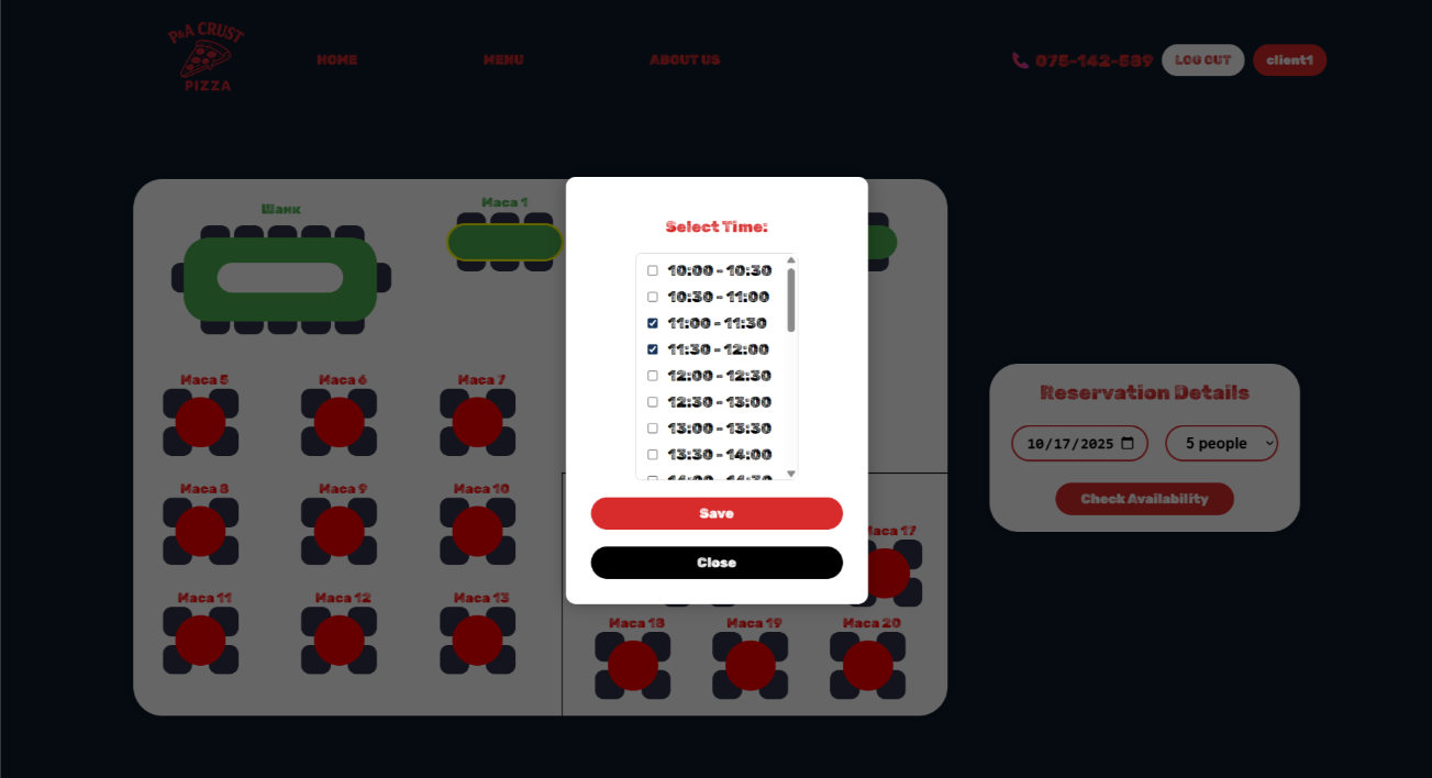 Функцијата checkTablesAvailability, го контролира целиот процес на проверка на достапноста на масите во ресторанот. Кога корисникот ќе внесе датум, време и број на луѓе, оваа функција праќа POST барање кон backend API-то (/api/check-table) за секоја маса од ресторанот. Backend-от враќа податок дали масата е слободна или веќе резервирана во избраниот термин. Компонентата потоа споредува дали капацитетот на таа маса е доволен за бројот на гости и соодветно ја поставува нејзината состојба во tableStatus како "available" или "unavailable". Визуелно, овие информации се прикажуваат во интерфејсот со различни бои за секоја маса, овозможувајќи му на корисникот лесно да избере каде да седи.