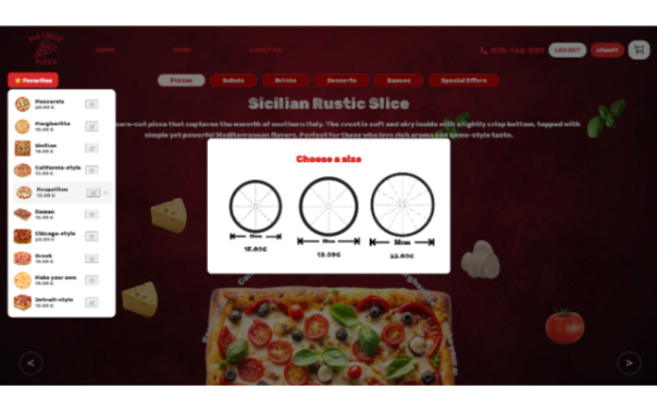 Функционалноста Favorites овозможува корисникот да зачувува омилени пици за побрз и полесен пристап при идни нарачки. При додавање на пица во омилени, системот преку backend API ја поврзува избраната пица со најавениот корисник и ја зачувува во базата на податоци. При вчитување на страната, апликацијата ги презема сите омилени пици поврзани со корисникот и ги прикажува во посебен Favorites дел. За секоја омилена пица се користат нејзините уникатни ID вредности, преку кои се извлекуваат целосните информации за производот (ID, име, цена и слика). Дополнително, корисникот има можност директно од Favorites делот да отстрани пица од омилени или да ја додаде во кошничката со избрана големина, без потреба од повторна навигација кон страната на производот.