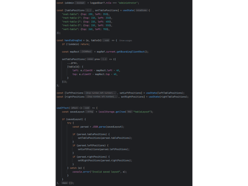Функционалноста за поместување на масите овозможува администраторот интерактивно да ги преместува масите на мапата со drag и drop. При завршување на поместувањето, системот ја пресметува новата позиција на масата врз основа на позицијата на глувчето и границите на мапата, по што тие координати (top и left) се зачувуваат во состојбата на апликацијата. Позициите на масите можат дополнително да се зачуваат во локалната меморија (localStorage), со што се обезбедува задржување на истиот распоред и по освежување или повторно вчитување на страницата. На овој начин системот овозможува флексибилно управување со распоредот на масите без потреба од промени во базата на податоци.