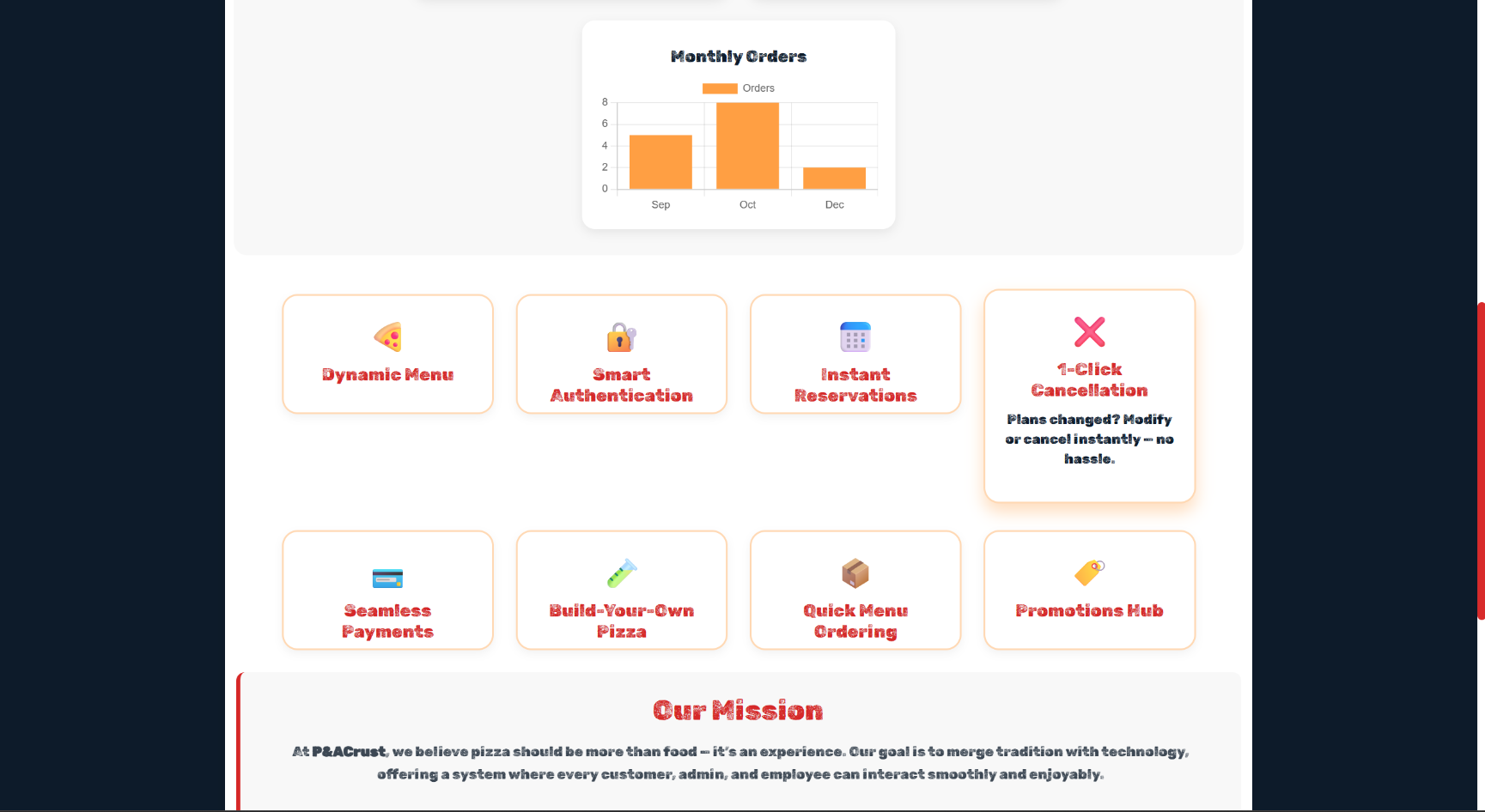Функцијата за статистики на страната "About Us" ја повлекува потребната информација од backend серверот и ги визуелизира преку различни типови на графици. Кај Pie графикот ја прикажува листата на најмногу нарачувани пици, со цел да се добие јасна слика кои производи се најпопуларни меѓу клиентите. Потоа, Doughnut графикот ја прикажува распределбата на корисниците според нивната улога – клиенти, вработени и администратори – овозможувајќи брз увид во структурата на корисничката база. Bar графикот ја презентира активноста на нарачките во тековните месеци, прикажувајќи бројот на нарачки за секој месец со вистински имиња на месеците (на пример Sept, Oct, Nov), што овозможува лесно споредување и следење на трендови. Со оваа комбинација на графици, апликацијата нуди динамичен, интерактивен и лесен за разбирање преглед на најважните статистики, помагајќи им на администраторите и корисниците да го следат успехот на платформата, популарноста на производите и активноста на клиентите на ефикасен и визуелно привлечен начин.