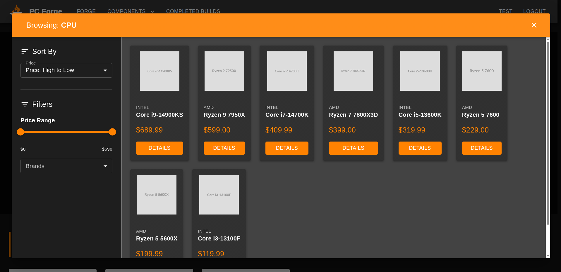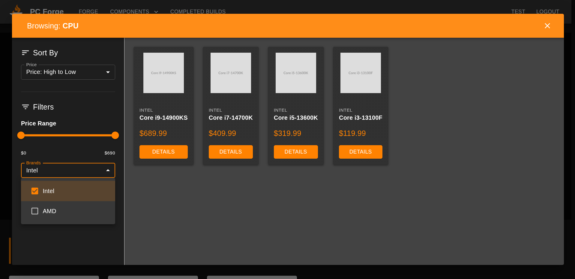 Step 5. Optionally the user can apply a brand filter on the left side of the panel, for example filtering all components that are made by "Intel".
