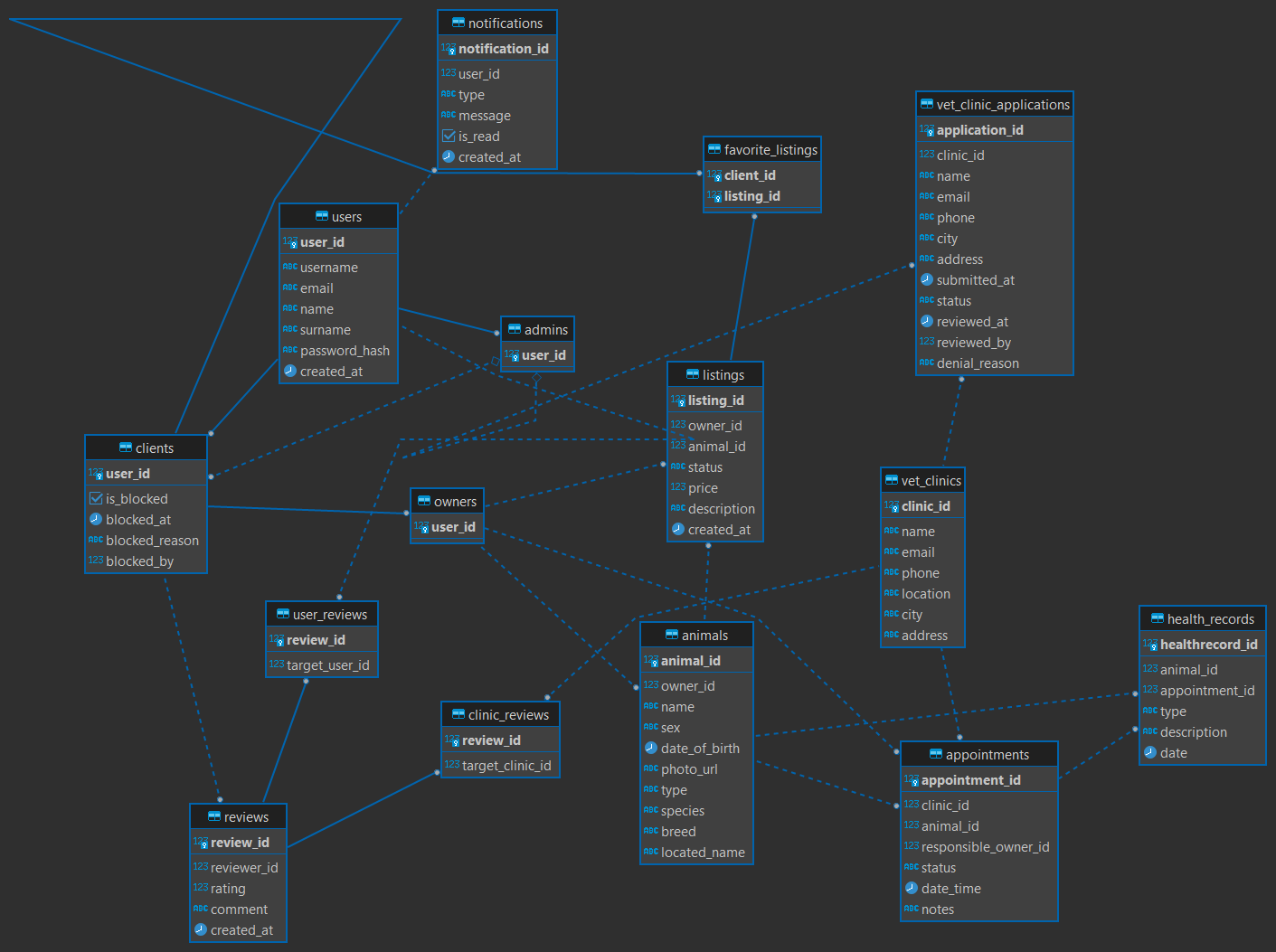 - Appointment(appointment_id [PK], clinic_id [FK→VetClinic(clinic_id)], animal_id [FK→Animal(animal_id)], responsible_owner_id [FK→Owner(user_id)], status, date_time, notes)