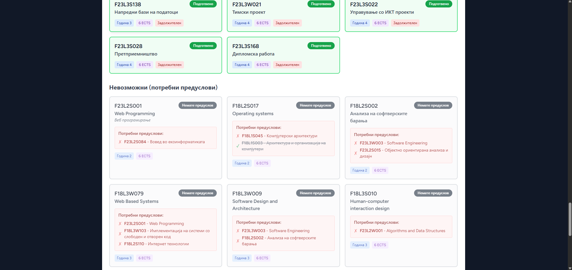Невозможни предмети бидејќи студентот не исполнува даден предуслов за предмет.