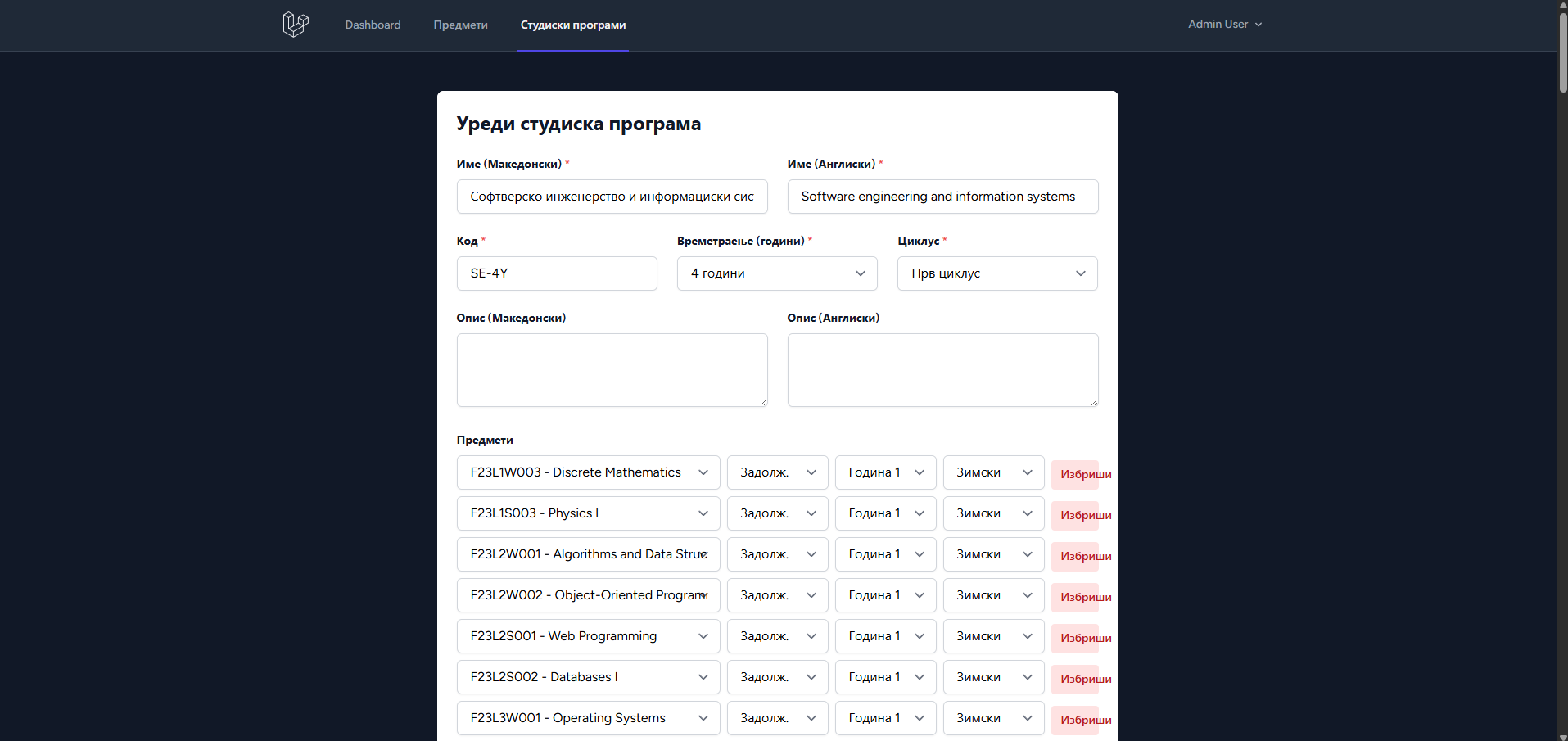 Одржување на информации за предмети (Админ)