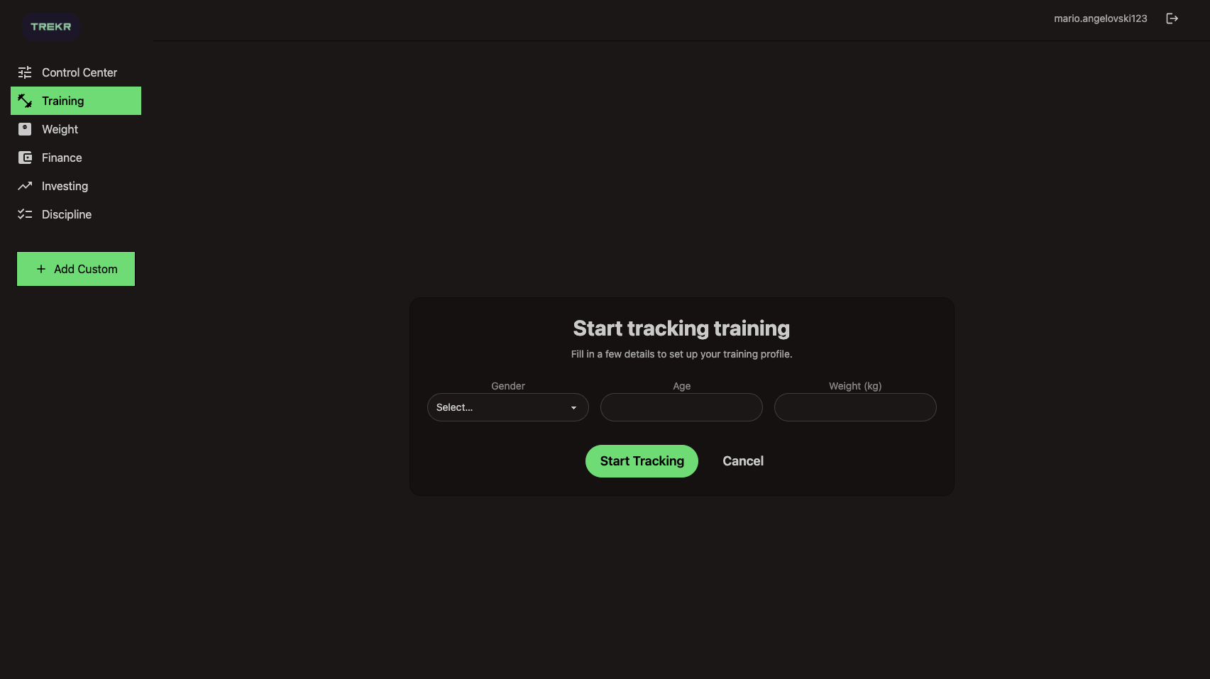 Доколку корисникот го кликне копчето "Start Training Tracking" се пренасочува на форма за иницијализирање на следењето каде што има полиња за gender, age, weight