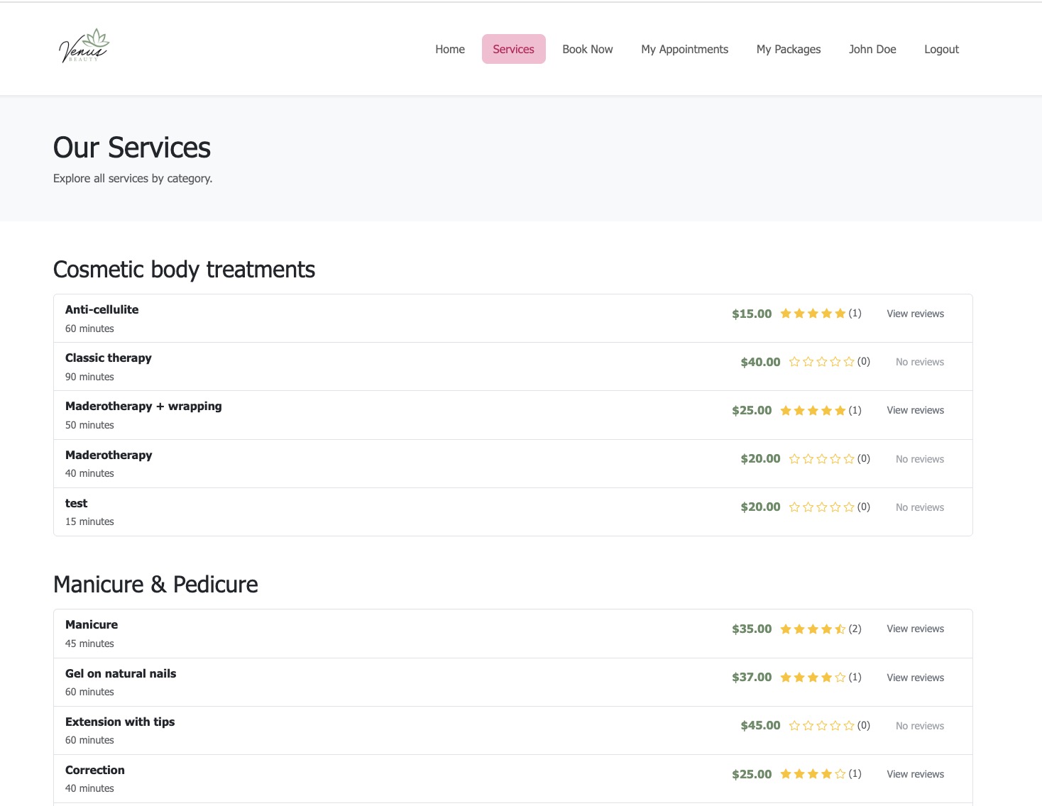 - деталите за услуги (име, цена, времетраење, број на рецензии и комплетен список на рецензии),