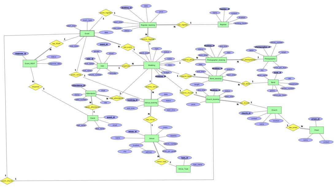 - Venue_booking resolves M:N between Wedding and Venue and stores date/time/status/price.