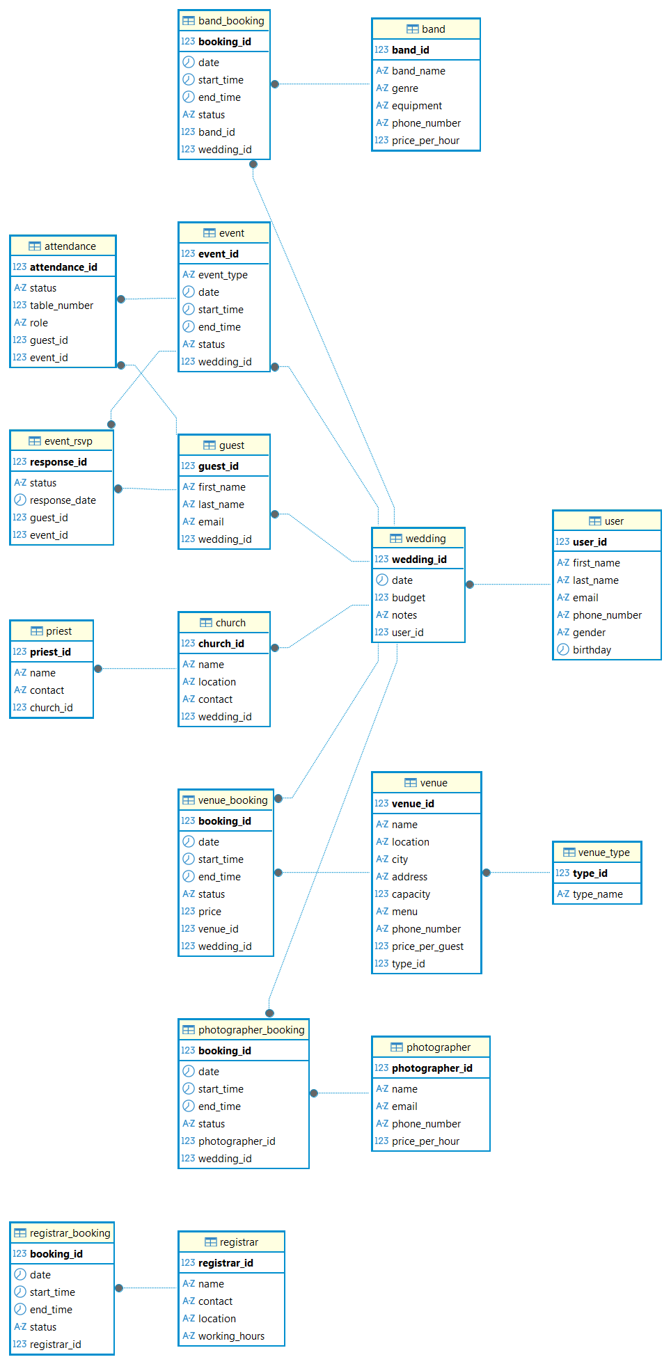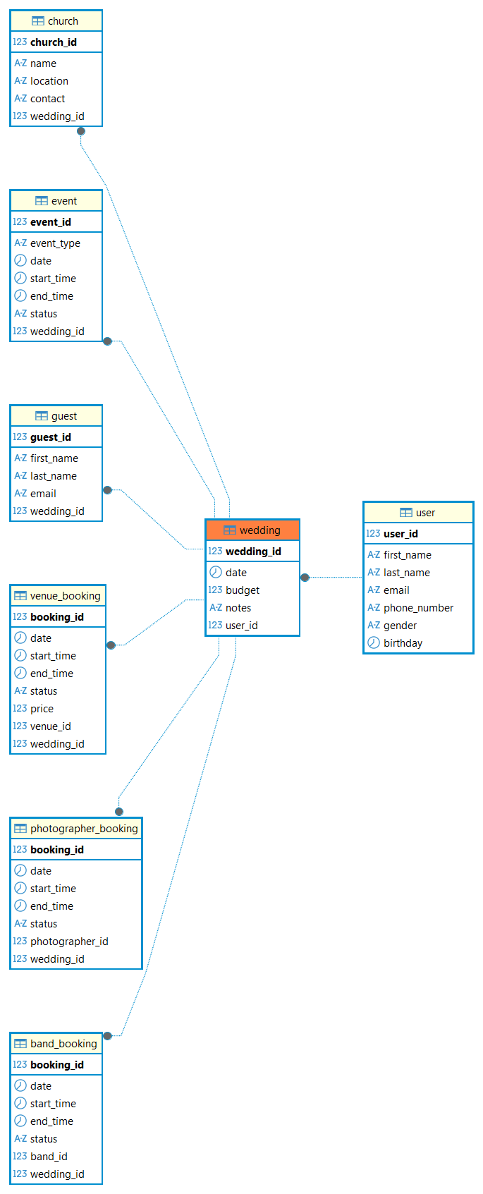 WEDDING(wedding_id, date, budget, notes, type, status, user_id*)