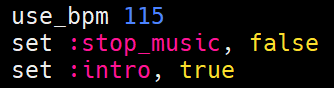 Првично, во Sonic Pi, сетираме кој BPM ќе го користиме со use_bpm, заедно со 2 cues (set,get), кои во Sonic Pi може да ги разбериме како boolean променливи, кои ќе ни помогнат со преградување на одредени делови.