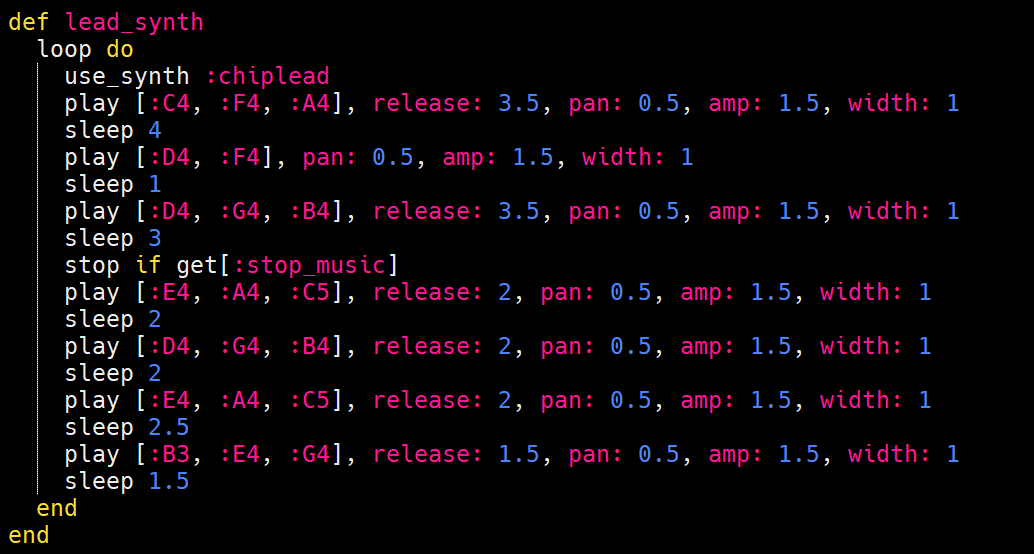 После дефинирањето на инструментите и секциите, останува уште да се приредуваат и да се сетират потребните cues, при што добиваме финалната песна во Sonic Pi.