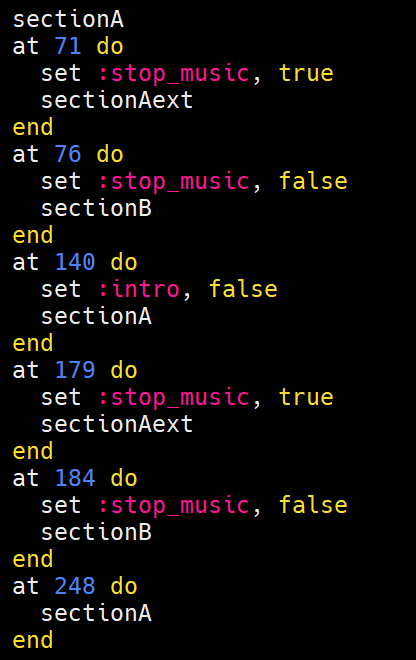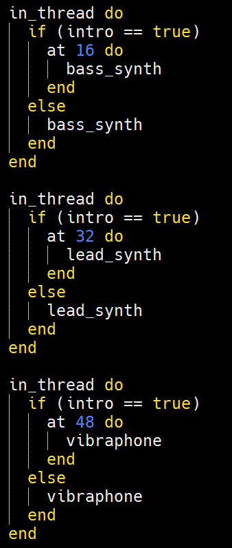 Во овај случај, на почетокот на песната правиме set на промелнива intro: true; со која притоа во дефиницијата на Section A, ставаме if на get:intro кое проверува и ако е true, со користење на at отсвирува инструментот на даден beat.