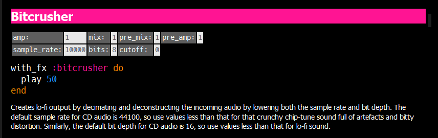 Притоа, најважно му додаваме веќе дискусираниот ефект нa Bitcrusher, со сетиран sample_rate на 33.1 KHz што намалува sample rate на звукот и ни дава автентичен звук на NES sample на тапани.