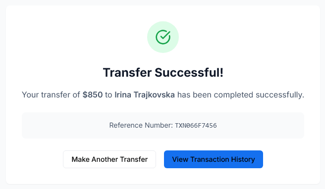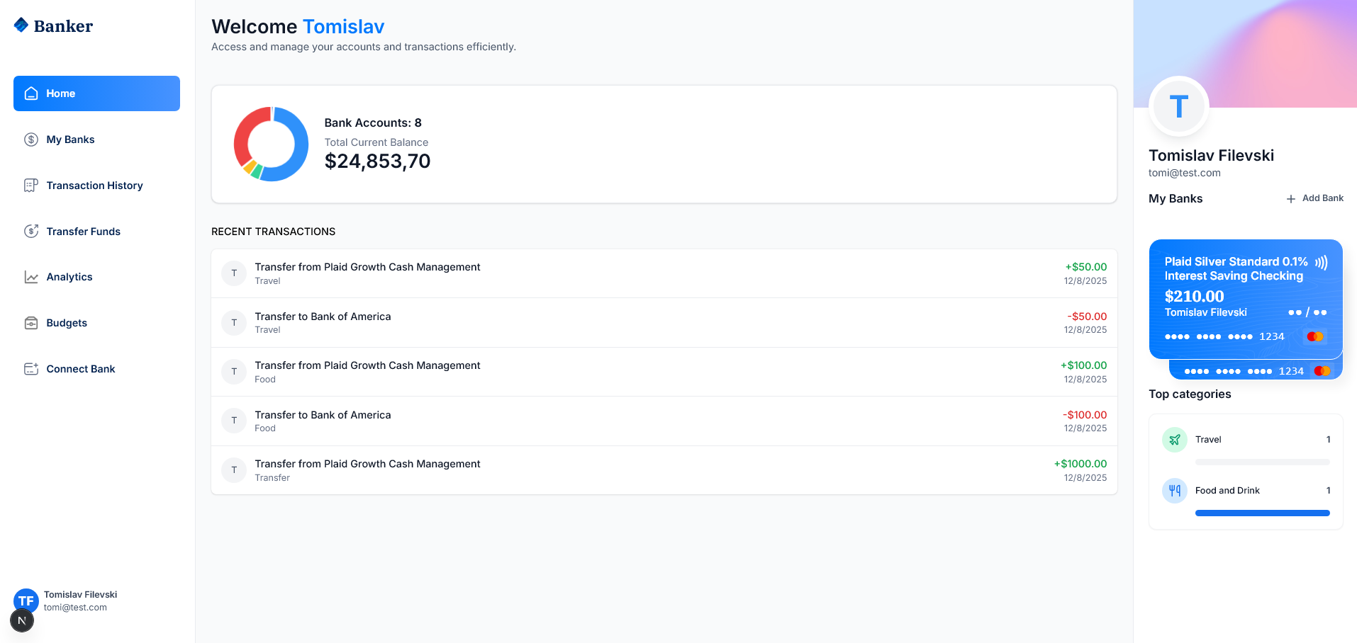 Backend API го враќа вкупниот баланс, бројот на сметки и последните трансакции.