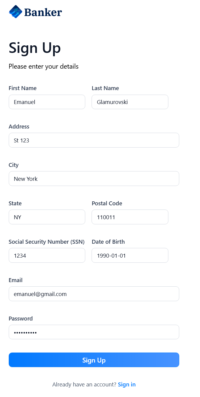 Притоа, корисникот е пренасочен кон /sign-up каде што внесува потребни информации за регистрација (име, презиме, адреса, град, држава, поштенски код, SSN, датум на раѓање, email, лозинка).
