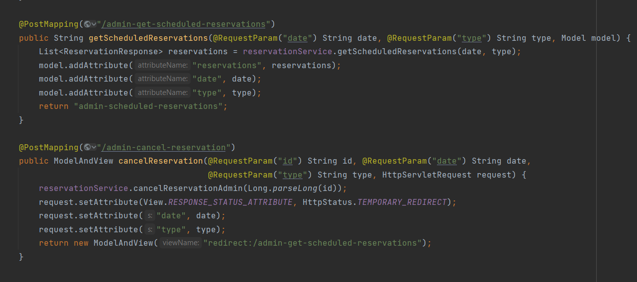 Администраторот најпрво избира соодветен датум и тип на услуга и потоа се повикува методот 'admin-get-scheduled-reservations' од контролерот за резервации. Од тука, се повикува методот 'getScheduledReservations' од сервисниот слој, при што се прави пребарување во базата на податоци според датум и тип на услуга. Резултатот се сместува во моделот и се враќа назад на администраторот. Администраторот исто така може да откаже резервација преку копчето 'Cancel Reservation' при што се повикува методот 'admin-cancel-reservation' од контролерот за резервации, при што се испраќа ИД на резервацијата,датумот и типот на резервацијата. Потоа се повикува 'cancelReservationAdmin' методот од сервисниот слој, при што резервацијата се брише од базата на податоци.