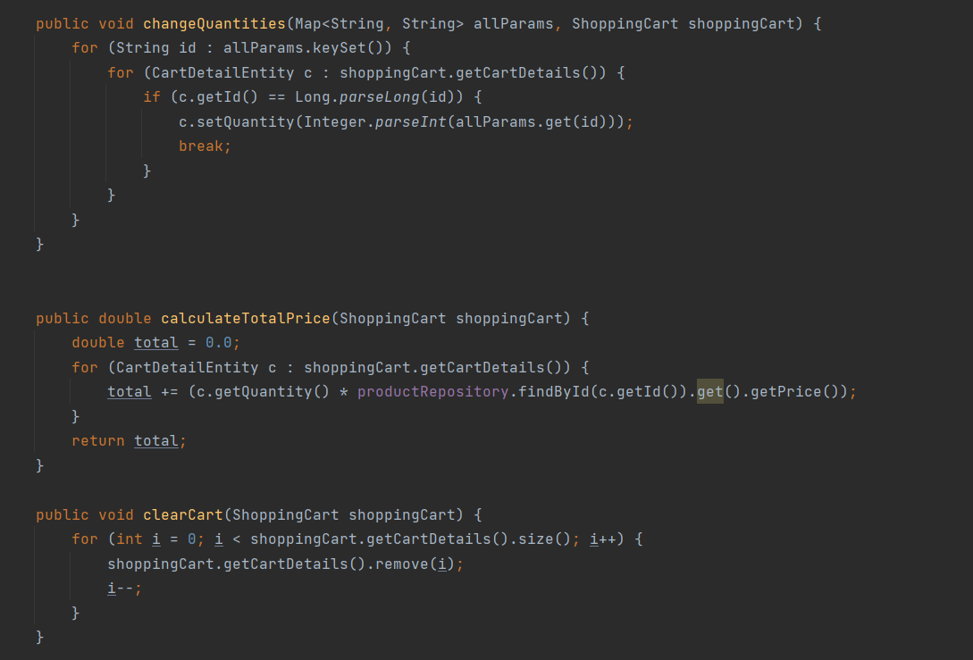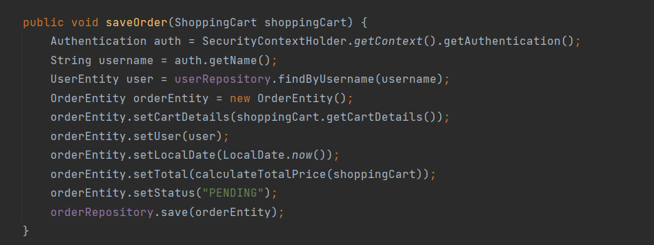 За секој избран продукт од страна на корисникот се повикува методот 'add-to-cart' од контролерот за кошничката , при што се испраќа ИД на продуктот што го избрал корисникот и тој се зачувува во сесијата. При нарачка се повикува методот 'order' од контролерот за нарачки, при што прво се валидираат квантитетите за секој продукт и потоа се повикува методот 'saveOrder' од сервисниот слој, при што се креира објект од тип 'Order Entity' и се зачувува во базата на податоци. Во самиот објект имаме информации за нарачката(од кој е направена, кога е направена, вкупната цена на нарачката, статусот на нарачката итн.). Исто така, во базата се зачувуваат и деталите на нарачките, кој производ е нарачан и квантитетот за тој производ.На крајот, се бришат сите информации за нарачката од сесијата на самиот корисник