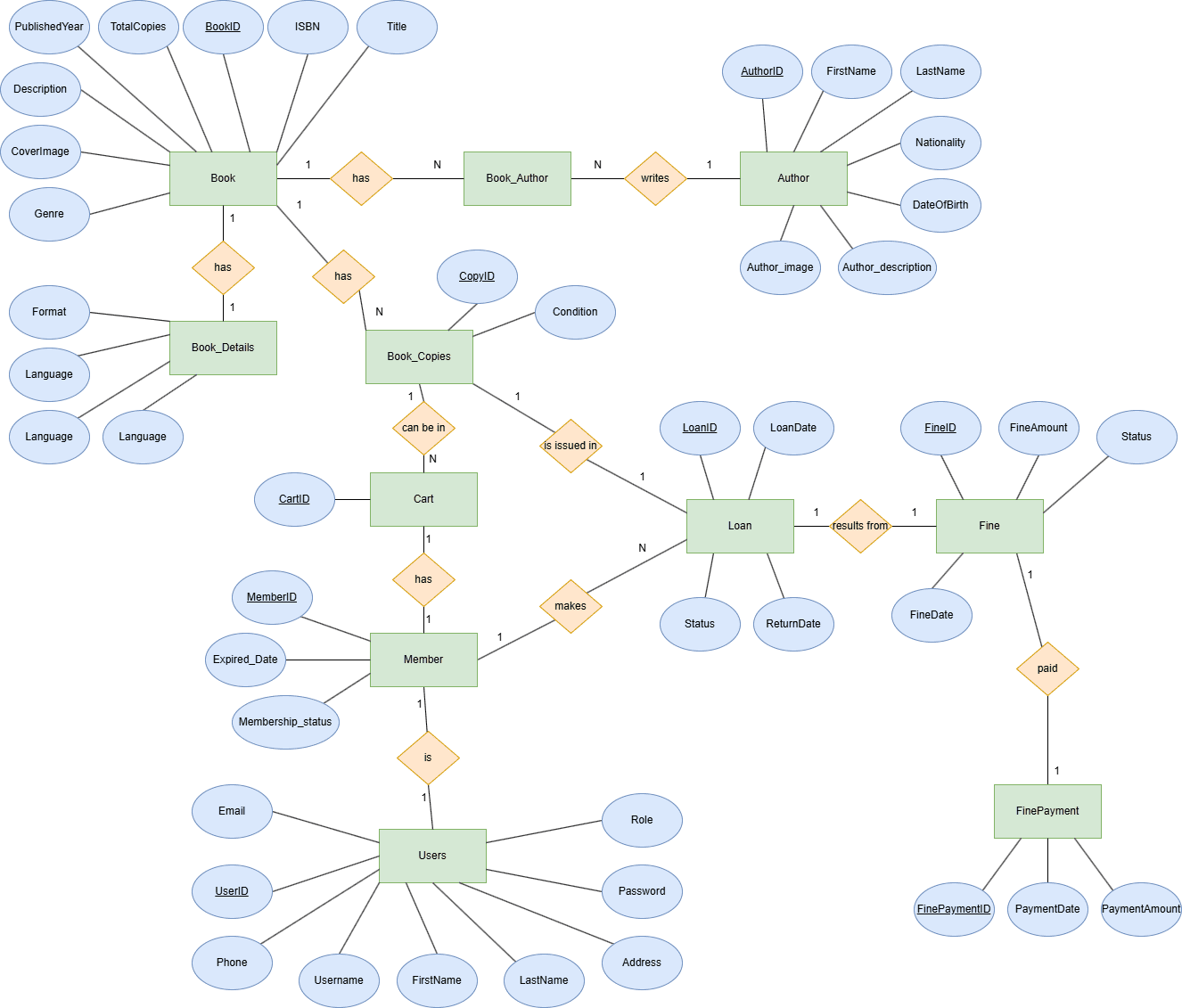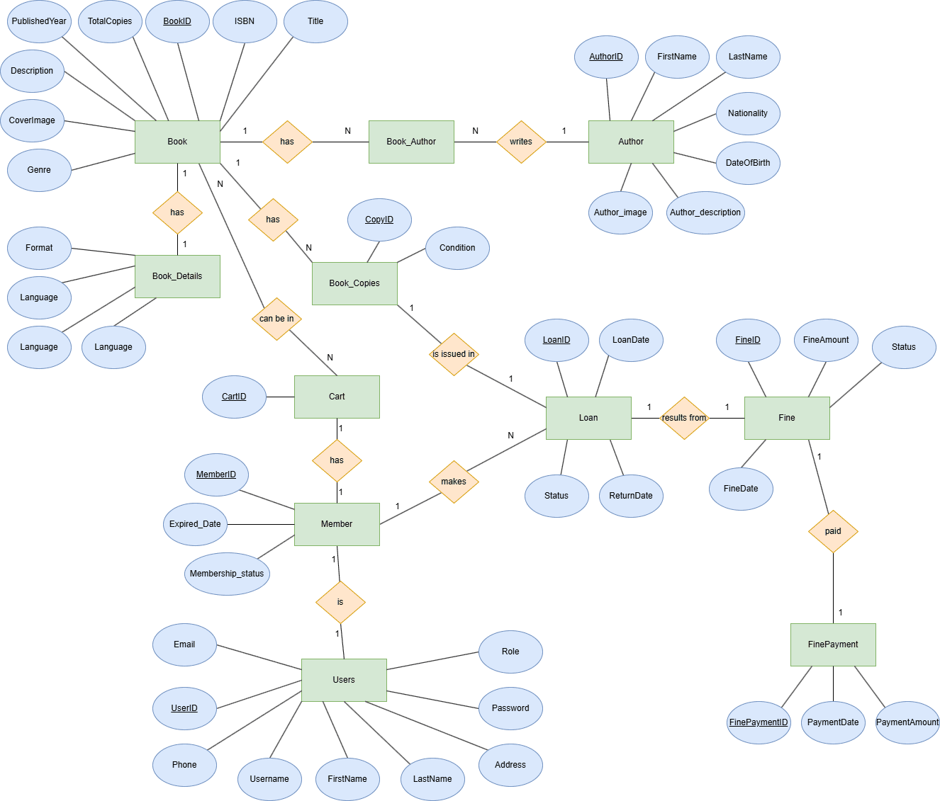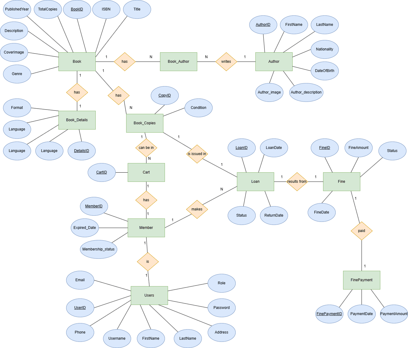 - Book_Copies → Loan: 1:1 - Еден примерок од книга може да биде дел од еден заем.