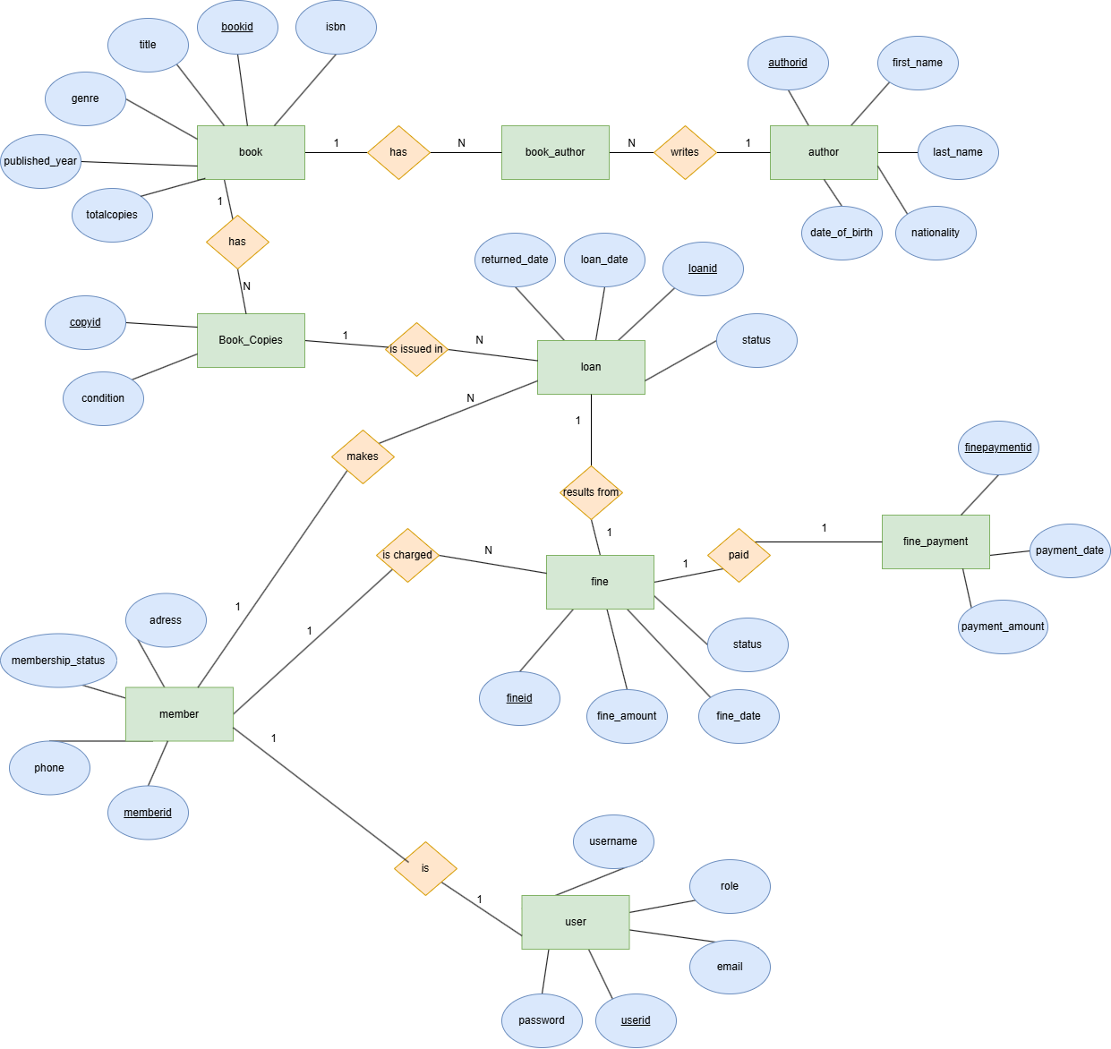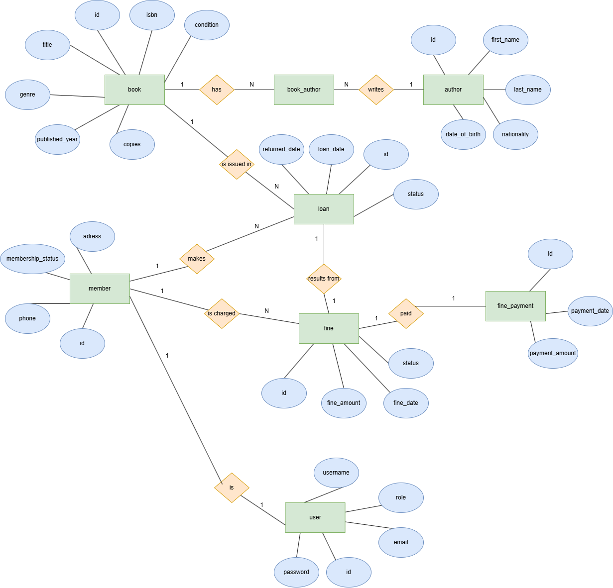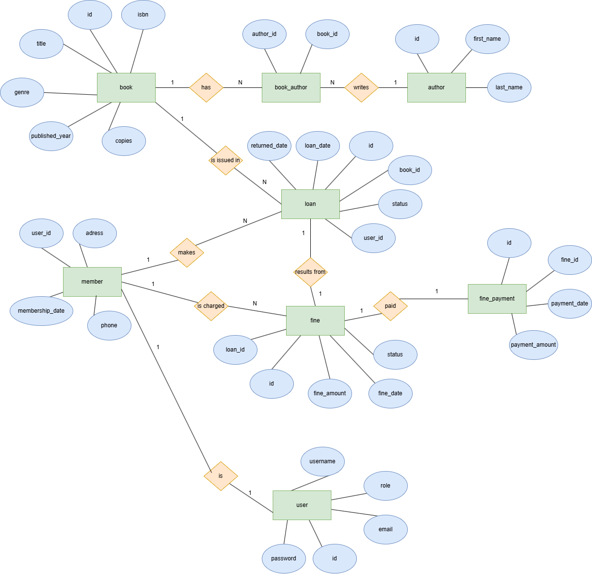 - Member → Loan: 1:N - Еден член може да има повеќе заеми.