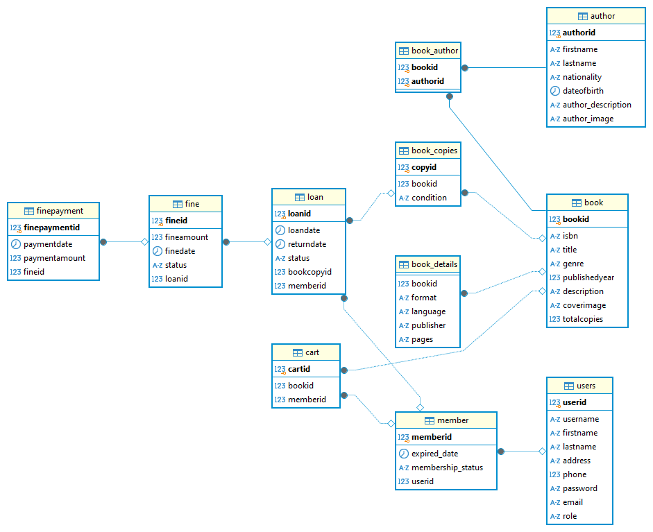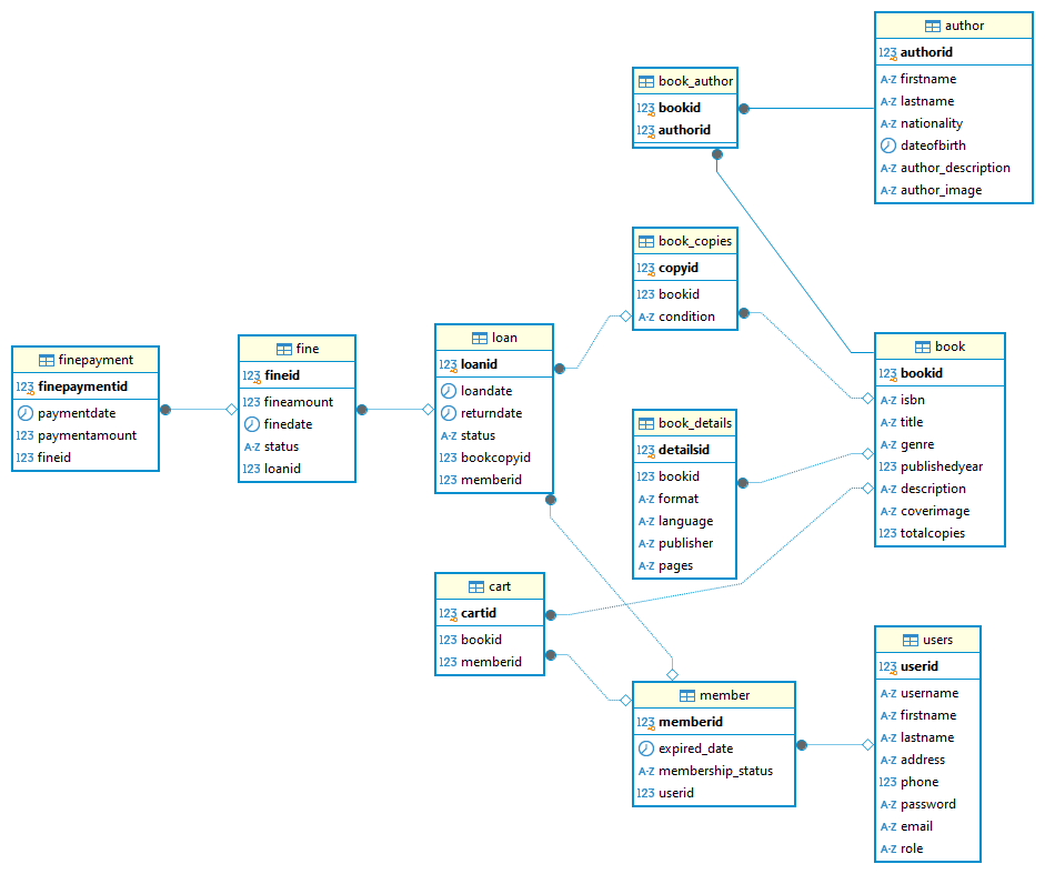 - (LoanID, LoanDate, ReturnDate, Status, BookCopyID*(Book_Copies), MemberID*(Member))