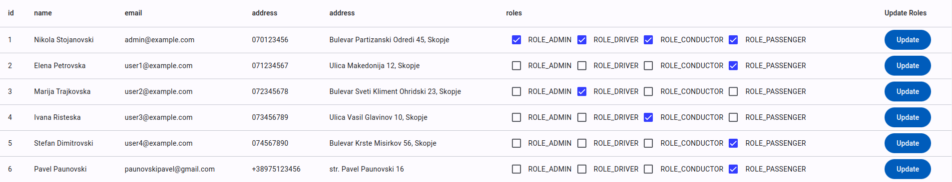 Секој корисник кога ќе создаде профил на апликацијата се подразбира дека е патник и затоа му се доделува улогата Патник. Потоа администраторите можат да додадат или одземат улоги: Кондуктер, Возач или Админ.