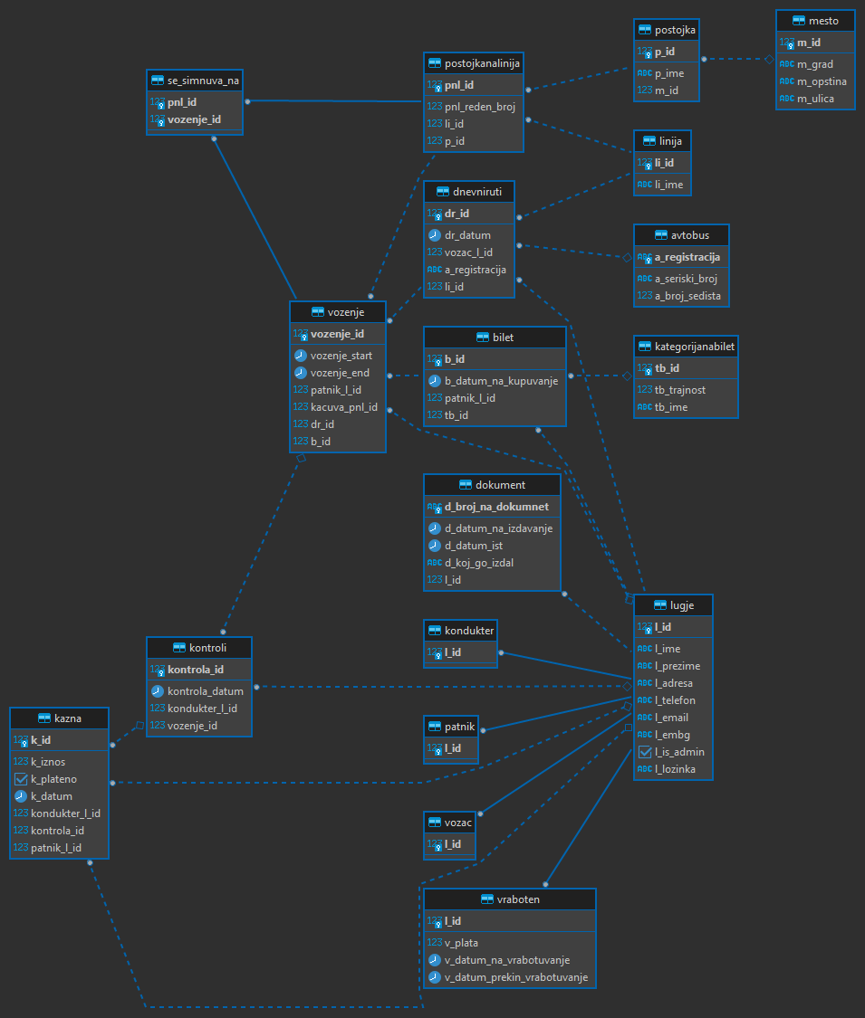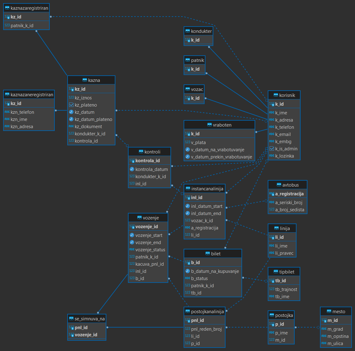 Kazna(kz_id, kz_iznos, kz_plateno, kz_datum, kz_datum_plateno, kz_dokument, kondukter_k_id*, kontrola_id)